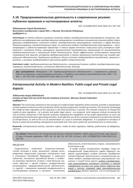 В статье уделено внимание понятию модели государственного регулирования экономики, приводится классификация мер государственного реагирования на введение санкционного режима рядом стран. Доказана необходимость изменения модели государственного регулирования экономики в сфере бизнеса. Проанализированы соответствующие меры по изменению модели государственного регулирования - частноправового и публично-правового характера. К таким мерам отнесены повышение роли унитарных предприятий в экономике России, расширение возможностей некоммерческих организаций по осуществлению предпринимательской и приносящей доход деятельности, более эффективное использование механизма страхования для защиты интересов предпринимателей, а также применение отступного как способа прекращения обязательств. Предложено введение в России системы предупреждения последствий, связанных с рисками, и системы предупреждения причинения вреда в строительстве.