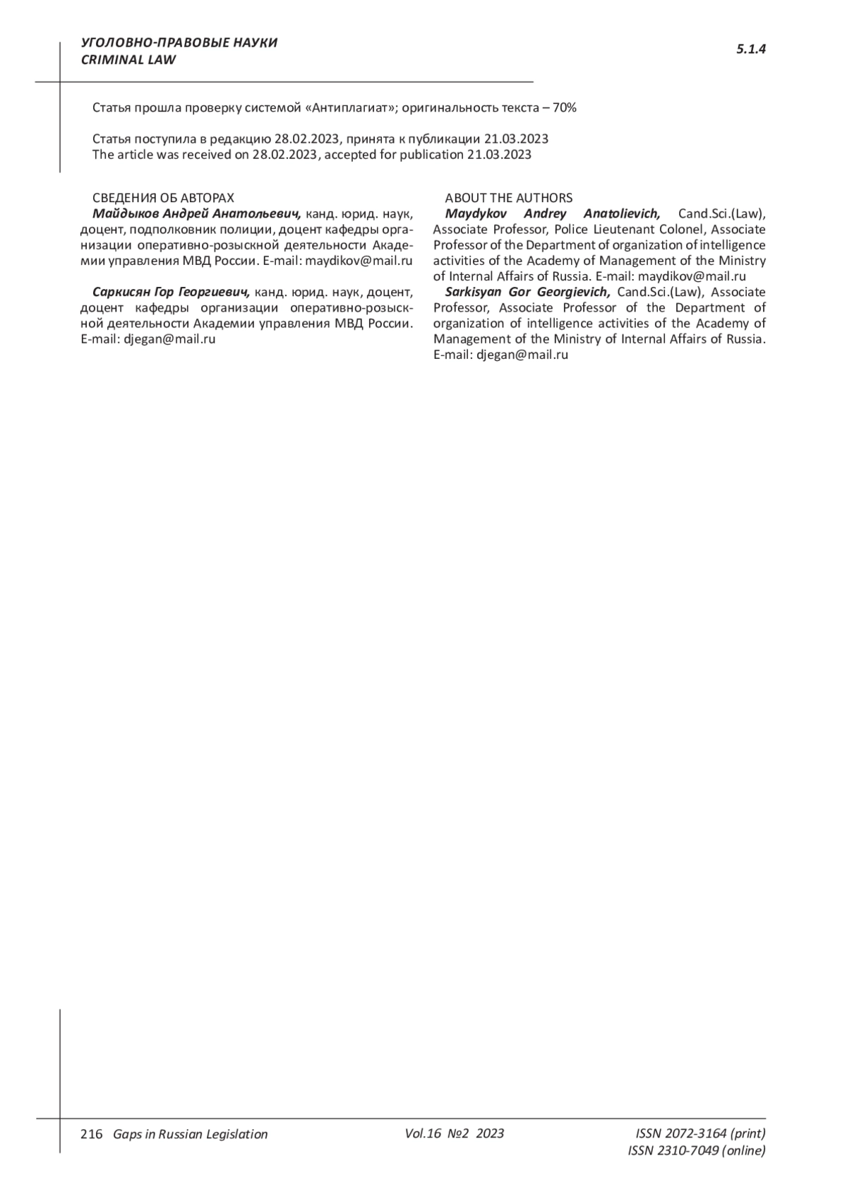 31. Жаров С.Н., Спришевский Н.С. О создании системы правового регулирования политического и уголовного сыска России в XIX - начале ХХ веков // Вестник Южно-Уральского государственного университета. 2012. № 20.