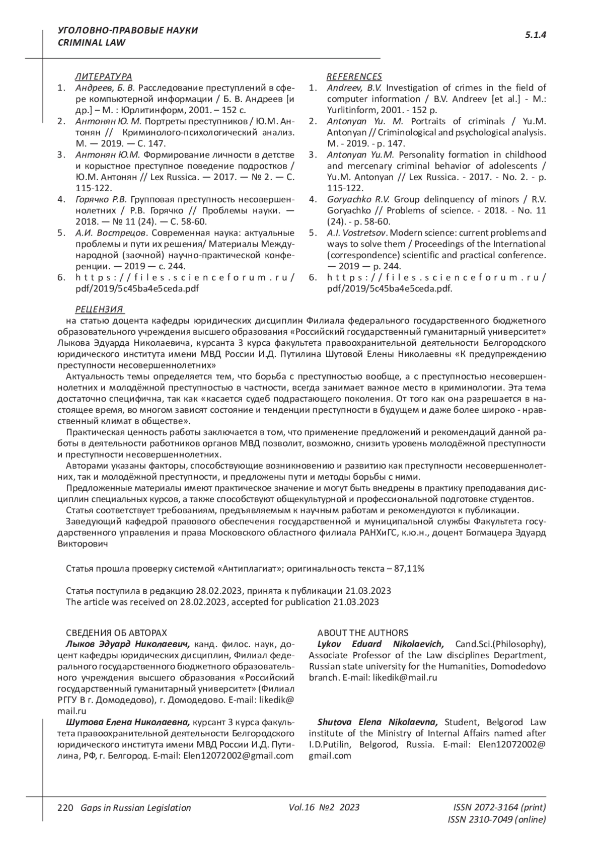 3. Антонян Ю.М. Формирование личности в детстве и корыстное преступное поведение подростков / Ю.М. Антонян // Lex Russica. - 2017. - № 2. - С. 115-122. EDN: YJJUST