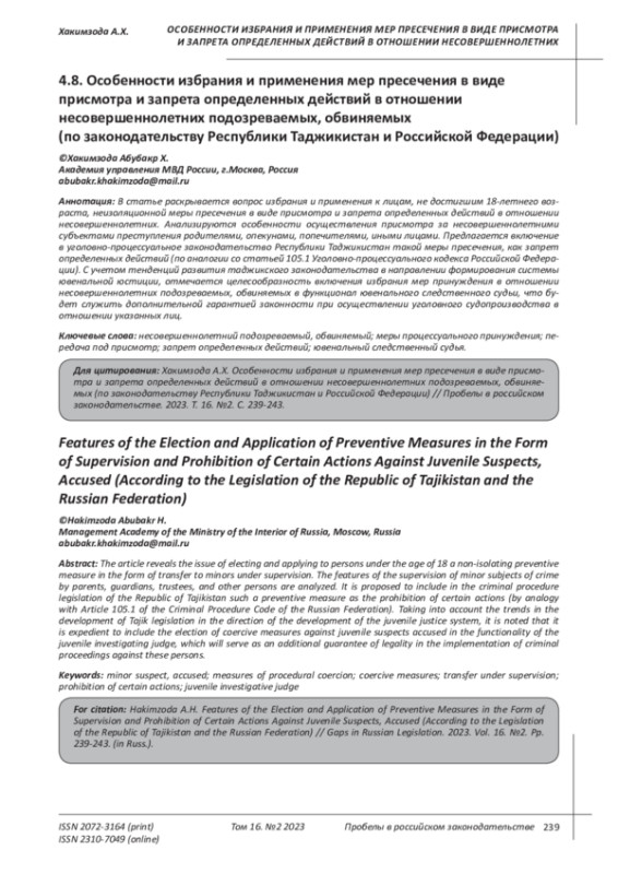 В статье раскрывается вопрос избрания и применения к лицам, не достигшим 18-летнего возраста, неизоляционной меры пресечения в виде присмотра и запрета определенных действий в отношении несовершеннолетних. Анализируются особенности осуществления присмотра за несовершеннолетними субъектами преступления родителями, опекунами, попечителями, иными лицами. Предлагается включение в уголовно-процессуальное законодательство Республики Таджикистан такой меры пресечения, как запрет определенных действий (по аналогии со статьей 105.1 Уголовно-процессуального кодекса Российской Федерации). С учетом тенденций развития таджикского законодательства в направлении формирования системы ювенальной юстиции, отмечается целесообразность включения избрания мер принуждения в отношении несовершеннолетних подозреваемых, обвиняемых в функционал ювенального следственного судьи, что будет служить дополнительной гарантией законности при осуществлении уголовного судопроизводства в отношении указанных лиц.