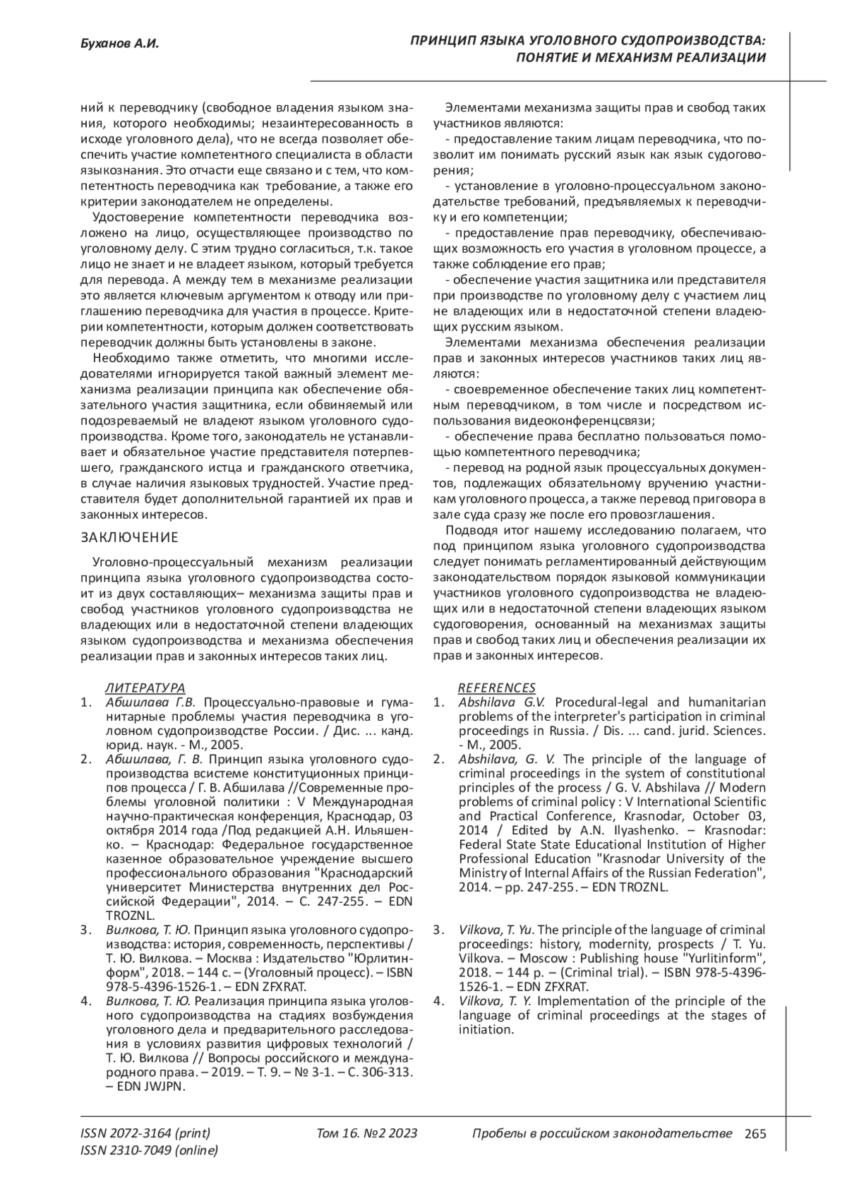 Vilkova, T. Yu. The principle of the language of criminal proceedings: history, modernity, prospects / T. Yu. Vilkova. - Moscow: Publishing house “Yurlitinform”, 2018. - 144 p. - (Criminal trial). ISBN: 978-5-4396-1526-1 EDN: ZFXRAT