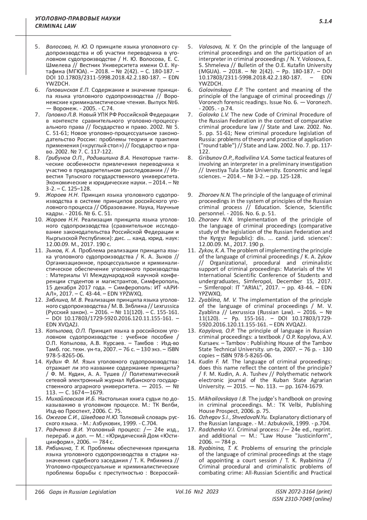 9. Жороев Н.Н. Принцип языка уголовного судопроизводства в системе принципов российского уголовного процесса // Образование. Наука, Научные кадры. - 2016. № 6. С. 51. EDN: XRIIVR