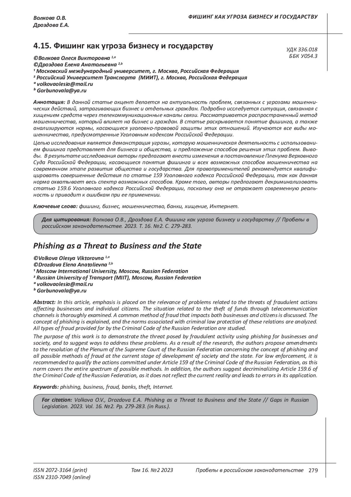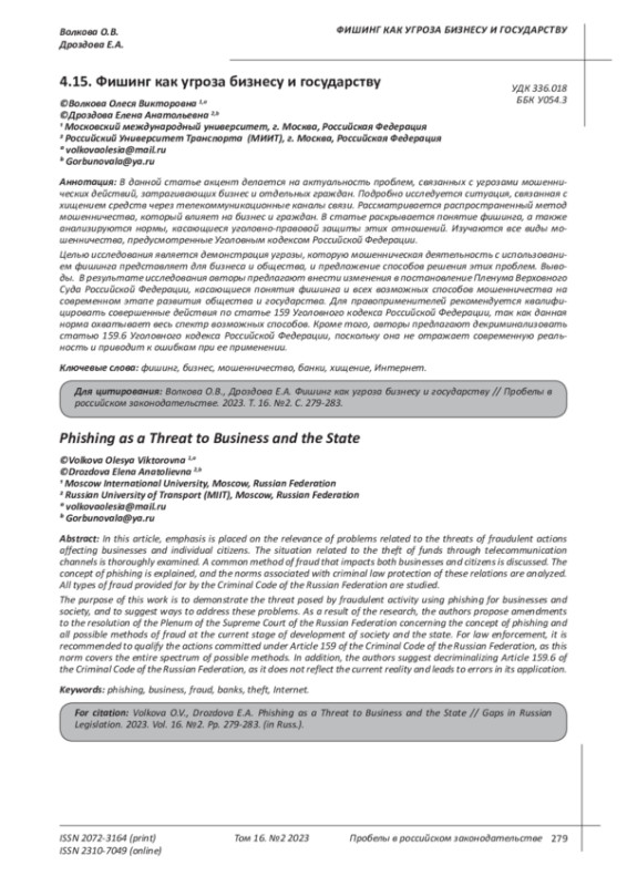 В данной статье акцент делается на актуальность проблем, связанных с угрозами мошеннических действий, затрагивающих бизнес и отдельных граждан. Подробно исследуется ситуация, связанная с хищением средств через телекоммуникационные каналы связи. Рассматривается распространенный метод мошенничества, который влияет на бизнес и граждан. В статье раскрывается понятие фишинга, а также анализируются нормы, касающиеся уголовно-правовой защиты этих отношений. Изучаются все виды мошенничества, предусмотренные Уголовным кодексом Российской Федерации. Целью исследования является демонстрация угрозы, которую мошенническая деятельность с использованием фишинга представляет для бизнеса и общества, и предложение способов решения этих проблем. Выводы. В результате исследования авторы предлагают внести изменения в постановление Пленума Верховного Суда Российской Федерации, касающиеся понятия фишинга и всех возможных способов мошенничества на современном этапе развития общества и государства. Для правоприменителей рекомендуется квалифицировать совершенные действия по статье 159 Уголовного кодекса Российской Федерации, так как данная норма охватывает весь спектр возможных способов. Кроме того, авторы предлагают декриминализовать статью 159.6 Уголовного кодекса Российской Федерации, поскольку она не отражает современную реальность и приводит к ошибкам при ее применении.