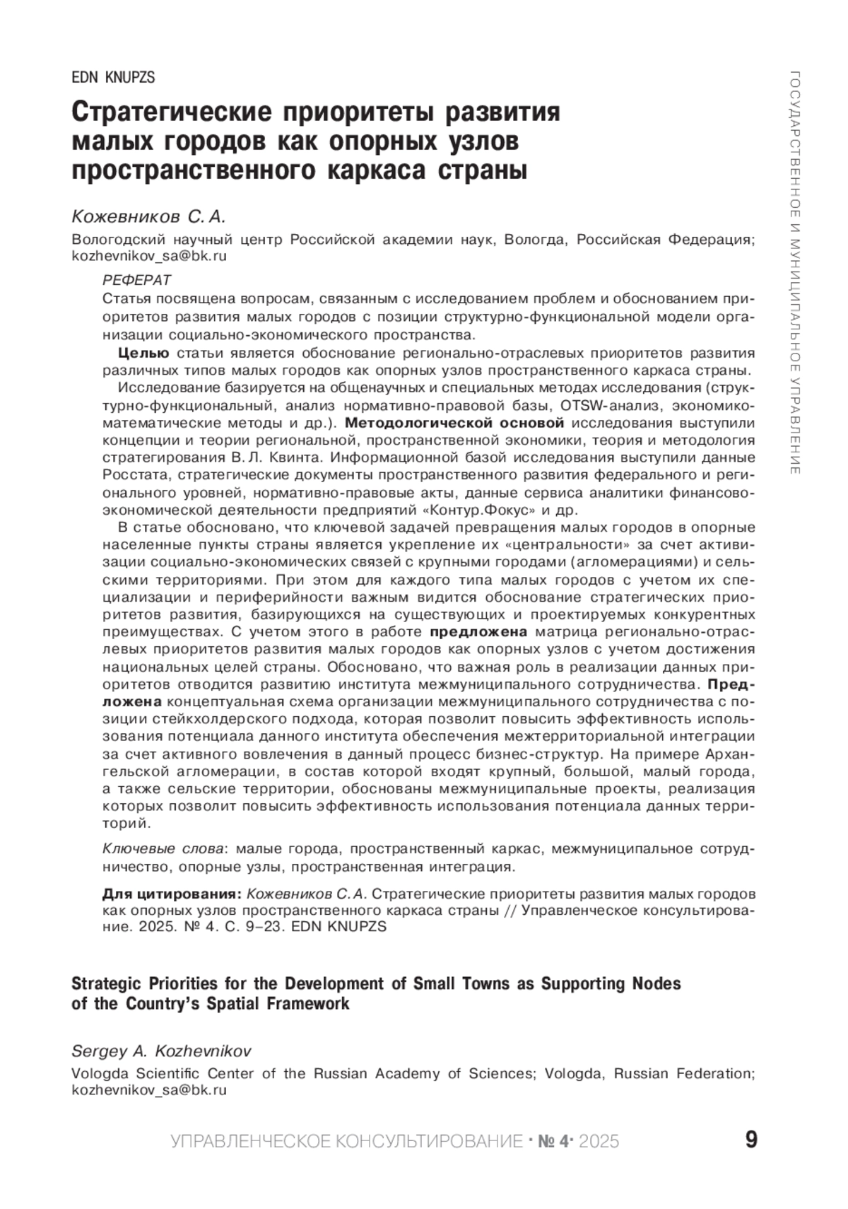 В статье обосновано, что ключевой задачей превращения малых городов в опорные населенные пункты страны является укрепление их «центральности» за счет активизации социально-экономических связей с крупными городами (агломерациями) и сельскими территориями. При этом для каждого типа малых городов с учетом их специализации и периферийности важным видится обоснование стратегических приоритетов развития, базирующихся на существующих и проектируемых конкурентных преимуществах. С учетом этого в работе предложена матрица регионально-отраслевых приоритетов развития малых городов как опорных узлов с учетом достижения национальных целей страны. Обосновано, что важная роль в реализации данных приоритетов отводится развитию института межмуниципального сотрудничества. Предложена концептуальная схема организации межмуниципального сотрудничества с позиции стейкхолдерского подхода, которая позволит повысить эффективность использования потенциала данного института обеспечения межтерриториальной интеграции за счет активного вовлечения в данный процесс бизнес-структур. На примере Архангельской агломерации, в состав которой входят крупный, большой, малый города, а также сельские территории, обоснованы межмуниципальные проекты, реализация которых позволит повысить эффективность использования потенциала данных территорий.