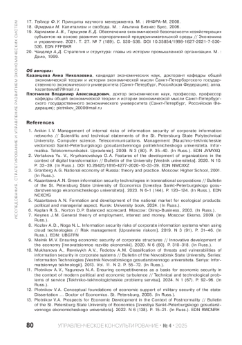 11. Плотников А.В., Ягунова Н. А. Обеспечение конкурентоспособности как основа экономической безопасности в условиях современной политико-экономической турбулентности // Технико-технологические проблемы сервиса. 2024. № 1 (67). С. 92-96.