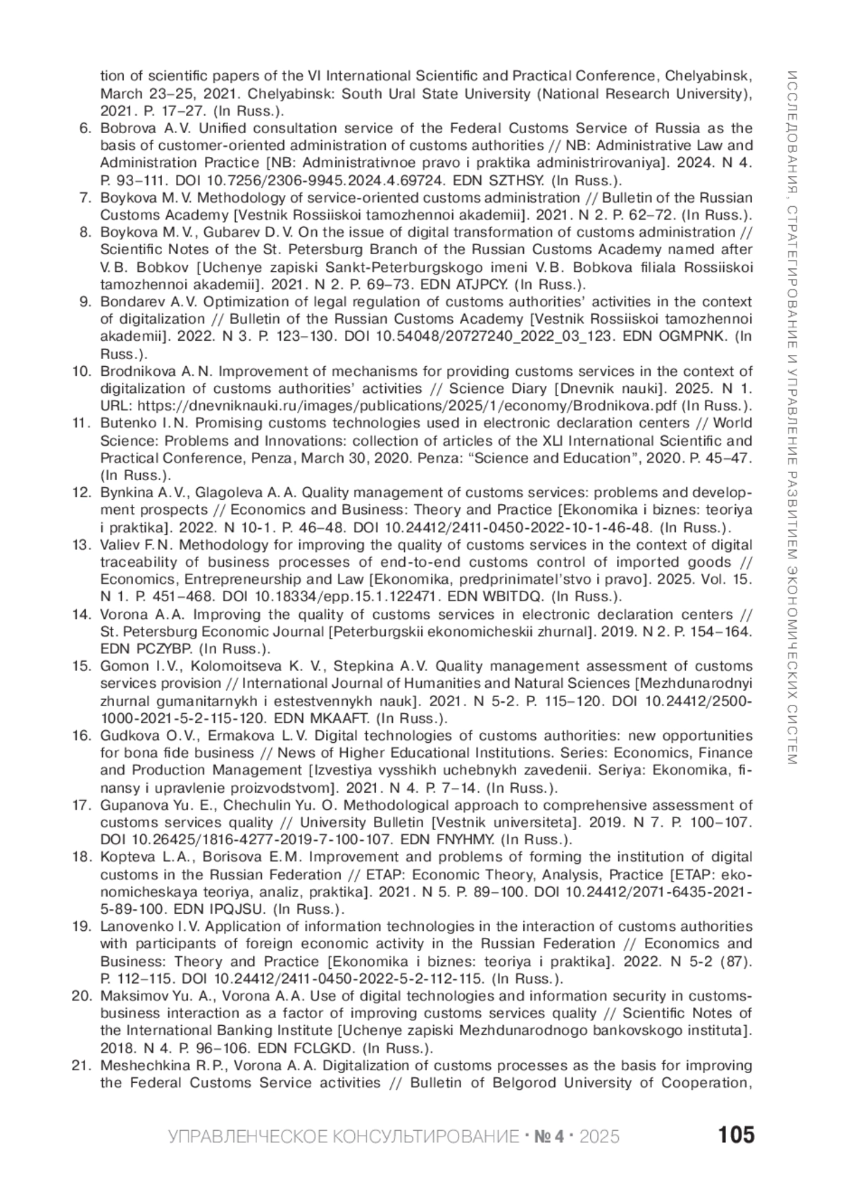 10. Бродникова А. Н. Совершенствование механизмов предоставления таможенных услуг в условиях цифровизации деятельности таможенных органов // Дневник науки. 2025. № 1. [Электронный ресурс] URL: https://dnevniknauki.ru/images/publications/2025/1/economy Brodnikova.pdf