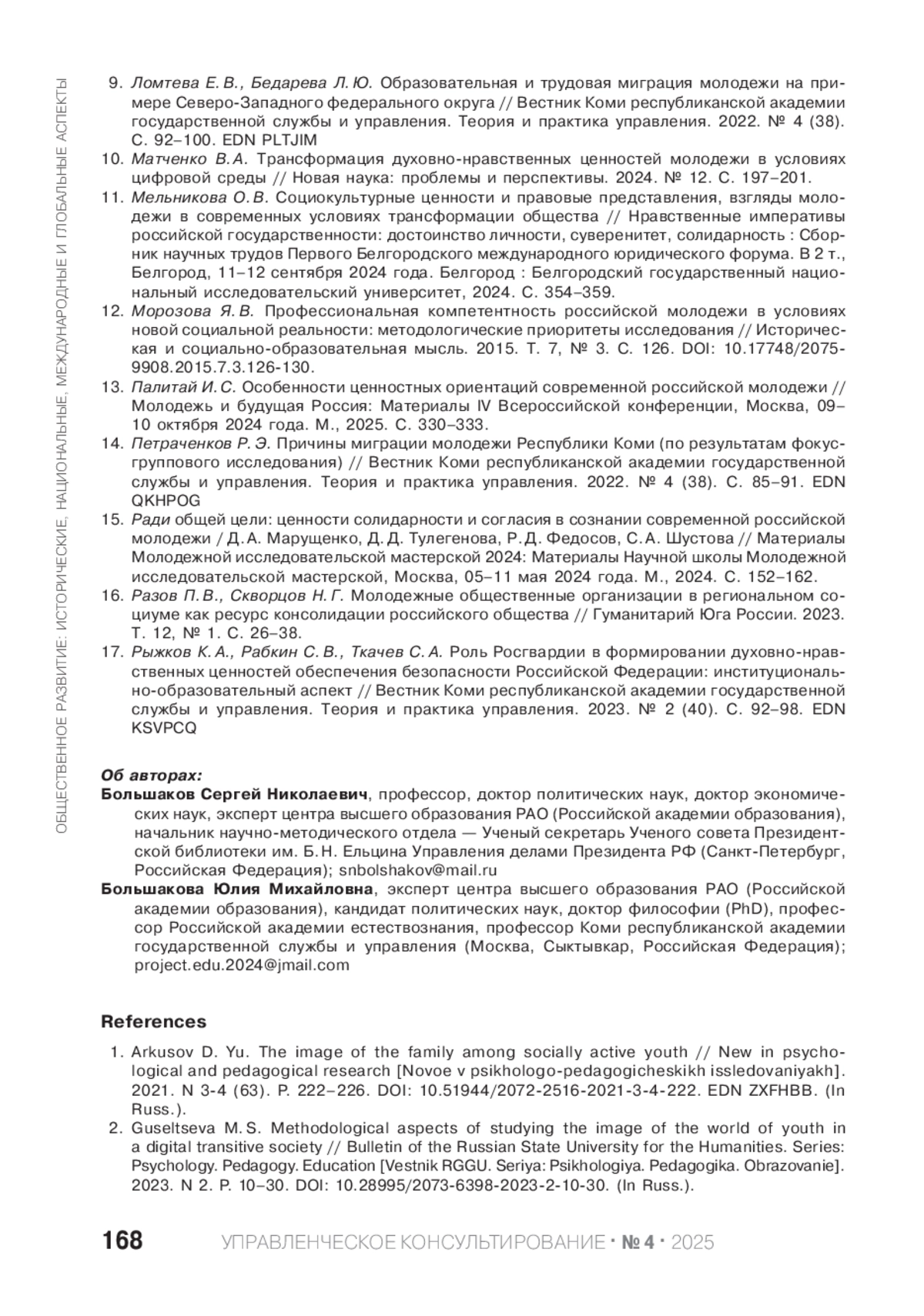 13. Палитай И. С. Особенности ценностных ориентаций современной российской молодежи // Молодежь и будущая Россия: Материалы IV Всероссийской конференции, Москва, 09- 10 октября 2024 года. М., 2025. С. 330-333.