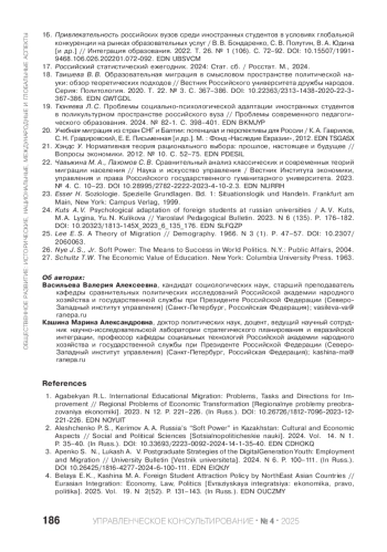 1. Агабекян Р. Л. Международная образовательная миграция: проблемы, задачи и направления совершенствования // Региональные проблемы преобразования экономики. 2023. № 12. С. 221-226. https://doi.org/10.26726/1812-7096-2023-12-221-226. EDN NOYUIT