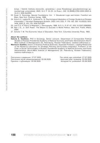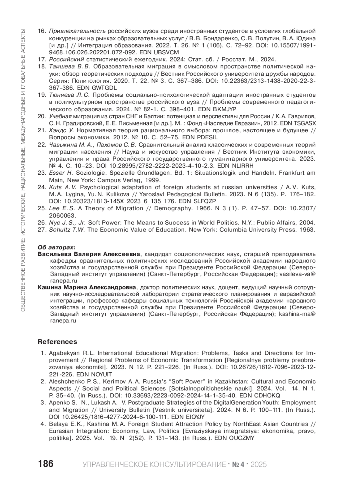 4. Белая Е.К., Кашина М.А. Политика привлечения иностранных студентов странами СевероВосточной Азии // Евразийская интеграция: экономика, право, политика. 2025. Т. 19, № 2(52). С. 131-143. EDN OUCZMY