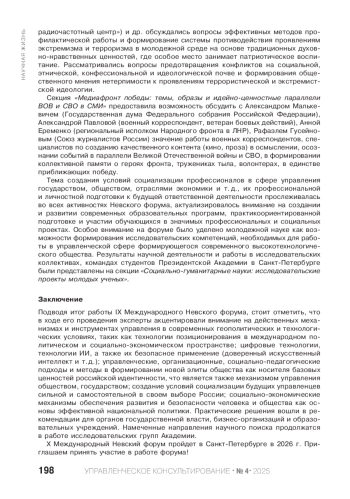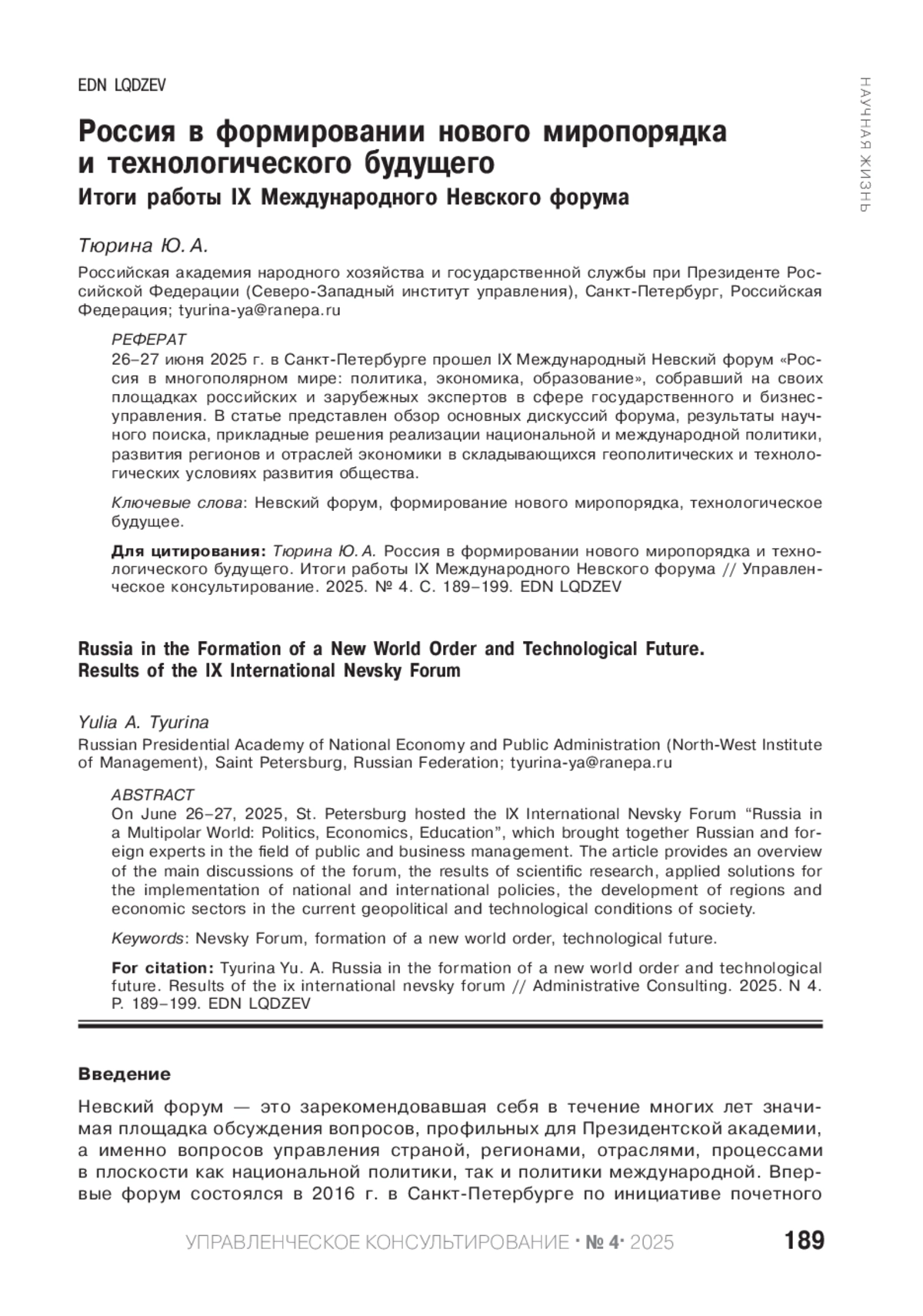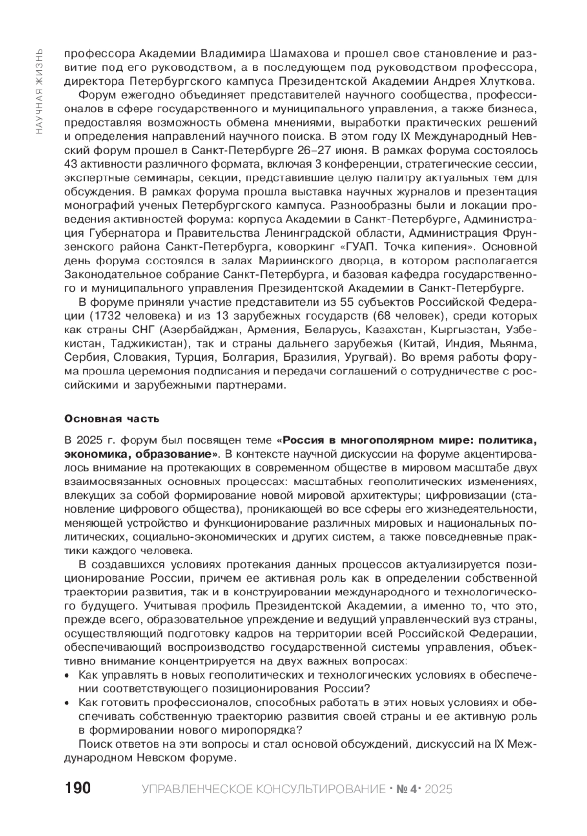 26–27 июня 2025 г. в Санкт-Петербурге прошел IX Международный Невский форум «Россия в многополярном мире: политика, экономика, образование», собравший на своих площадках российских и зарубежных экспертов в сфере государственного и бизнес-управления. В статье представлен обзор основных дискуссий форума, результаты научного поиска, прикладные решения реализации национальной и международной политики, развития регионов и отраслей экономики в складывающихся геополитических и технологических условиях развития общества.