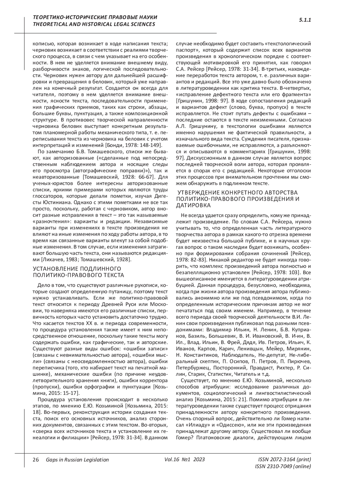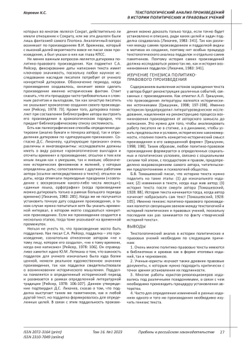 Юридическое источниковедение и текстология тесно взаимосвязаны между собой по причине сходного целеполагания. Как справедливо говорит С. В. Кодан, цель источниковедения в рамках истории политических и правовых учений – в создании теории, методологии и методики анализа источников познания государственно-правовой информации с применением опыта исследования текстов в социогуманитаристике [Кодан, 2021: 28-43]. В то время как текстология нацелена на обнаружение литературного предназначения памятника и выявление закономерностей и направлений развития; на погружение «в историю текста», определение тенденций и отражение процесса, рассмотрение явлений литературы согласно принципу историзма в их динамике, эволюции и взаимосвязях [Гришунин, 1998: 168]. Задачи текстологии, по С. А. Рейсеру, состоят в определении точного текста литературного произведения, кодификации текстов и последующем их комментировании [Рейсер, 1978: 10-12]. Получается, что равно, как история политических и правовых учений имеет текстологические задатки, так и текстология, рассматривающая литературные произведения в политико-правовом ключе, обладает свойствами, присущими «политученческой» истории, но в источниковедческом ракурсе.