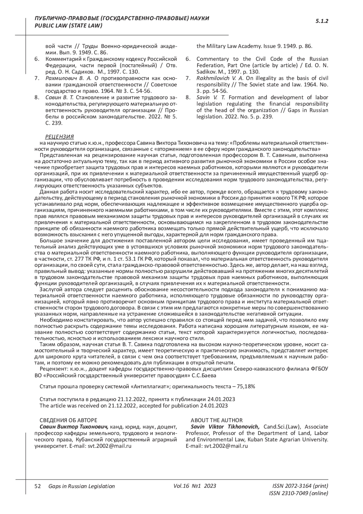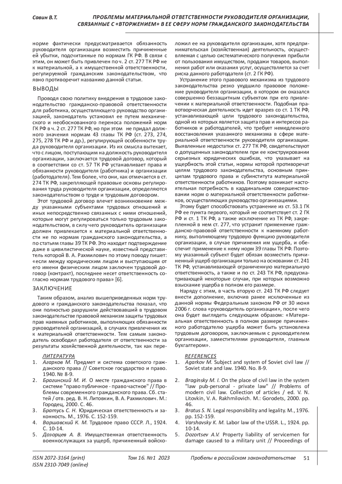 8. Савин В. Т. Становление и развитие трудового законодательства, регулирующего материальную ответственность руководителя организации // Пробелы в российском законодательстве. 2022. № 5. С. 239. EDN: IGIISR