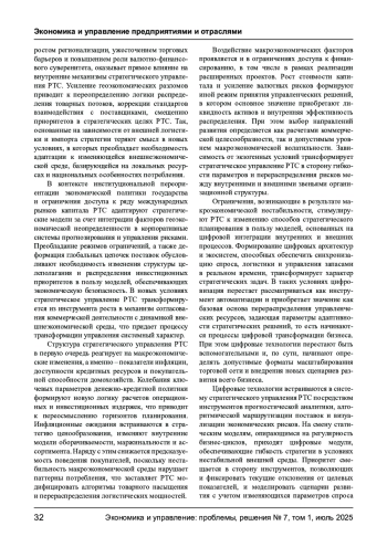 Выводы: а) трансформация управления осуществляется за счет цифровизации бизнес-процессов, интеграции нормативных ограничений и локализации ресурсных связей; б) стратегическая гибкость формируется внутри гибридных моделей, синхронизированных с параметрами поведения потребителей и государственной политикой; в) институциональная встраиваемость стратегий расширяет границы воспроизводства и закрепляет роль торговых сетей в реализации национальных целей развития.