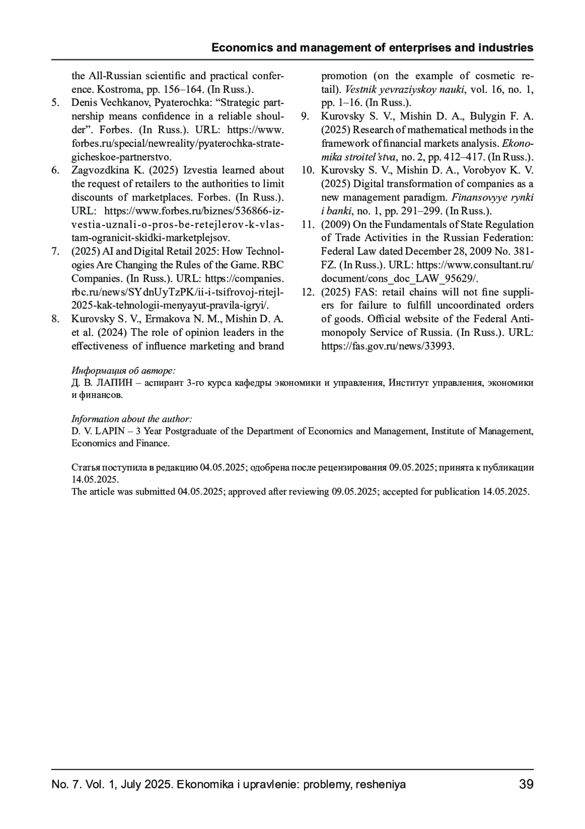 6. Загвоздкина К. “Известия” узнали о просьбе ретейлеров к властям ограничить скидки маркетплейсов. Forbes. 2025. URL: https://www.forbes.ru/biznes/536866-izvestia-uznali-o-pros-be-retejlerov-k-vlastam-ogranicit-skidki-marketplejsov.