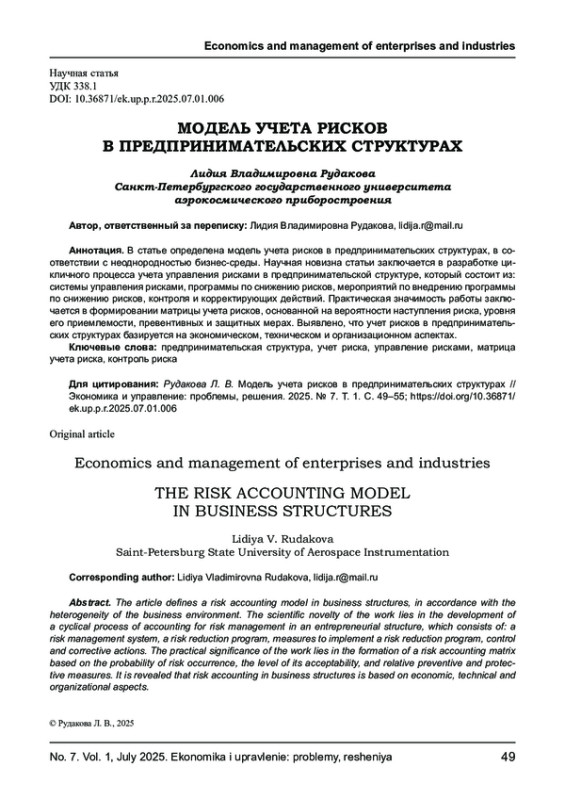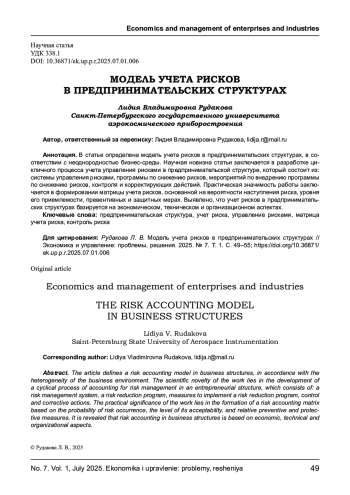 В статье определена модель учета рисков в предпринимательских структурах, в соответствии с неоднородностью бизнес-среды. Научная новизна статьи заключается в разработке цикличного процесса учета управления рисками в предпринимательской структуре, который состоит из: системы управления рисками, программы по снижению рисков, мероприятий по внедрению программы по снижению рисков, контроля и корректирующих действий. Практическая значимость работы заключается в формировании матрицы учета рисков, основанной на вероятности наступления риска, уровня его приемлемости, превентивных и защитных мерах. Выявлено, что учет рисков в предпринимательских структурах базируется на экономическом, техническом и организационном аспектах.