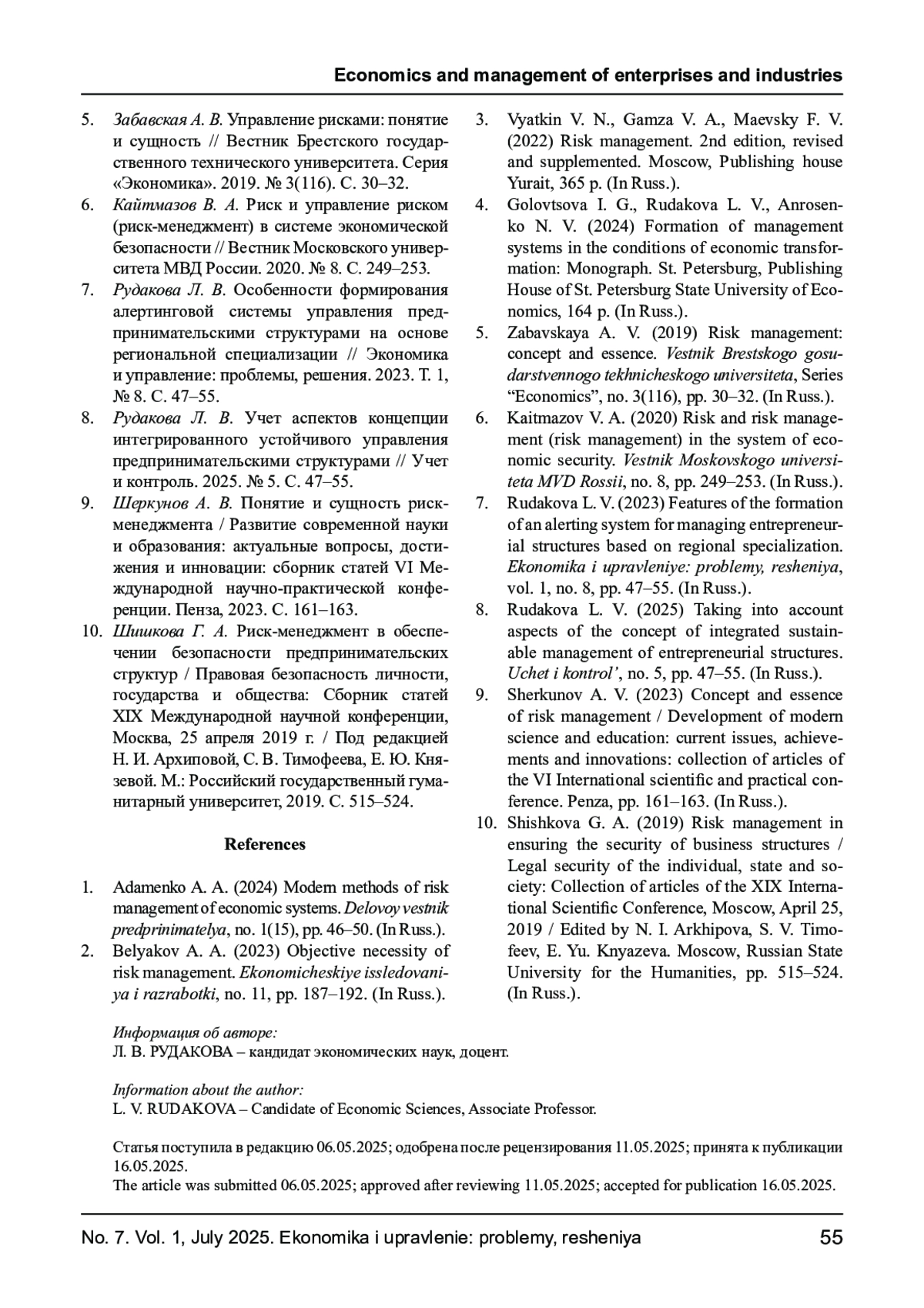 7. Рудакова Л. В. Особенности формирования алертинговой системы управления предпринимательскими структурами на основе региональной специализации // Экономика и управление: проблемы, решения. 2023. Т. 1, № 8. С. 47-55. EDN: RGZBAU