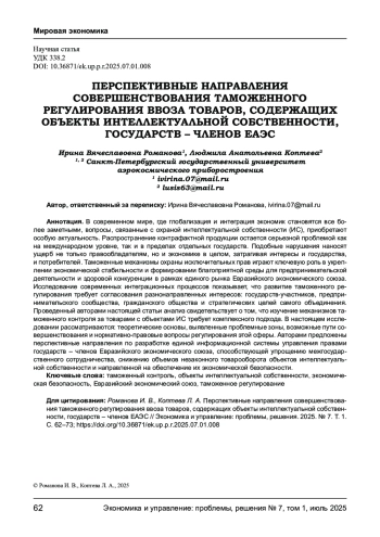 В современном мире, где глобализация и интеграция экономик становятся все более заметными, вопросы, связанные с охраной интеллектуальной собственности (ИС), приобретают особую актуальность. Распространение контрафактной продукции остается серьезной проблемой как на международном уровне, так и в пределах отдельных государств. Подобные нарушения наносят ущерб не только правообладателям, но и экономике в целом, затрагивая интересы и государства, и потребителей. Таможенные механизмы охраны исключительных прав играют ключевую роль в укреплении экономической стабильности и формировании благоприятной среды для предпринимательской деятельности и здоровой конкуренции в рамках единого рынка Евразийского экономического союза. Исследование современных интеграционных процессов показывает, что развитие таможенного регулирования требует согласования разнонаправленных интересов: государств-участников, предпринимательского сообщества, гражданского общества и стратегических целей самого объединения. Проведенный авторами настоящей статьи анализ свидетельствует о том, что изучение механизмов таможенного контроля за товарами с объектами ИС требует комплексного подхода. В настоящем исследовании рассматриваются: теоретические основы, выявленные проблемные зоны, возможные пути совершенствования и нормативно-правовые вопросы регулирования этой сферы. Авторами предложены перспективные направления по разработке единой информационной системы управления правами государств - членов Евразийского экономического союза, способствующей упрощению межгосударственного сотрудничества, снижению объемов незаконного товарооборота объектов интеллектуальной собственности и направленной на обеспечение их экономической безопасности.