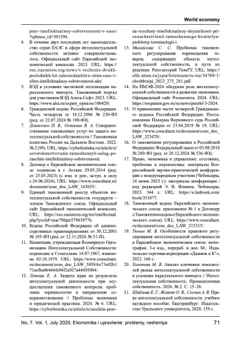 3. В ВОИС представлен комплексный обзор нарушений прав интеллектуальной собственности в ЕАЭС. Официальный сайт Евразийской экономической комиссии. 2025. URL: https://eec.eaeunion.org/news/v-voispredstavlen-kompleksnyy-obzor-narusheniyprav-intellektualnoy-sobstvennosti-v-eaes/?sphrase_id=391594.