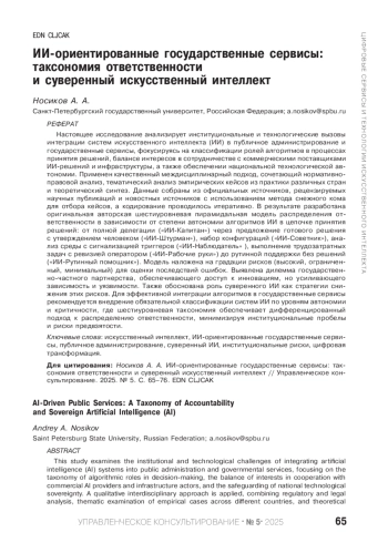 Настоящее исследование анализирует институциональные и технологические вызовы интеграции систем искусственного интеллекта (ИИ) в публичное администрирование и государственные сервисы, фокусируясь на классификации ролей алгоритмов в процессах принятия решений, балансе интересов в сотрудничестве с коммерческими поставщиками ИИ-решений и инфраструктуры, а также обеспечении национальной технологической автономии. Применен качественный междисциплинарный подход, сочетающий нормативноправовой анализ, тематический анализ эмпирических кейсов из практики различных стран и теоретический синтез. Данные собраны из официальных источников, рецензируемых научных публикаций и новостных источников с использованием метода снежного кома для отбора кейсов, а кодирование проводилось итеративно. В результате разработана оригинальная авторская шестиуровневая пирамидальная модель распределения ответственности в зависимости от степени автономии алгоритмов ИИ в цепочке принятия решений: от полной делегации («ИИ-Капитан») через предложение готового решения с утверждением человеком («ИИ-Штурман»), набор конфигураций («ИИ-Советник»), анализ среды с сигнализацией триггеров («ИИ-Наблюдатель» ), выполнение трудозатратных задач с ревизией оператором («ИИ-Рабочие руки») до рутинной поддержки без решений («ИИ-Рутинный помощник»). Модель наложена на градации рисков (высокий, ограниченный, минимальный) для оценки последствий ошибок. Выявлена дилемма государственно-частного партнерства, обеспечивающего доступ к инновациям, но усиливающего зависимость и уязвимости. Также обоснована роль суверенного ИИ как стратегии снижения этих рисков. Для эффективной интеграции алгоритмов в государственные сервисы рекомендуется внедрение обязательной классификации систем ИИ по уровням автономии и критичности, где шестиуровневая таксономия обеспечивает дифференцированный подход к распределению ответственности, минимизируя институциональные пробелы и риски предвзятости.