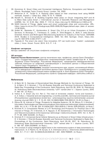 5. Киричек Р. В. Сети беспилотных летательных аппаратов как элемент инфраструктуры умных городов / Р. В. Киричек // 72-я Всероссийская научно-техническая конференция, посвященная Дню радио : Труды конференции, Санкт-Петербург, 20-28 апреля 2017 года. Санкт-Петербург: Санкт-Петербургский государственный электротехнический университет «ЛЭТИ» им. В. И. Ульянова (Ленина), 2017. С. 166-167. EDN ZOOMHR