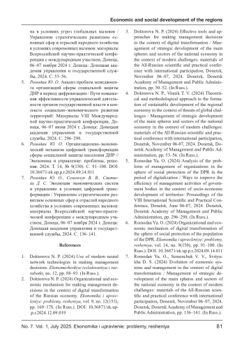 2. Докторова Н. П. Организационно-экономический механизм принятия управленческих решений в условиях цифровой трансформации экономики РФ // Экономика и управление: проблемы, решения. 2024. Т. 9, № 12(153). С. 169-178. 10.36871/ ek.up.p.r.2024.12.09.019. DOI: 10.36871/ek.up.p.r.2024.12.09.019 EDN: ASXJFW