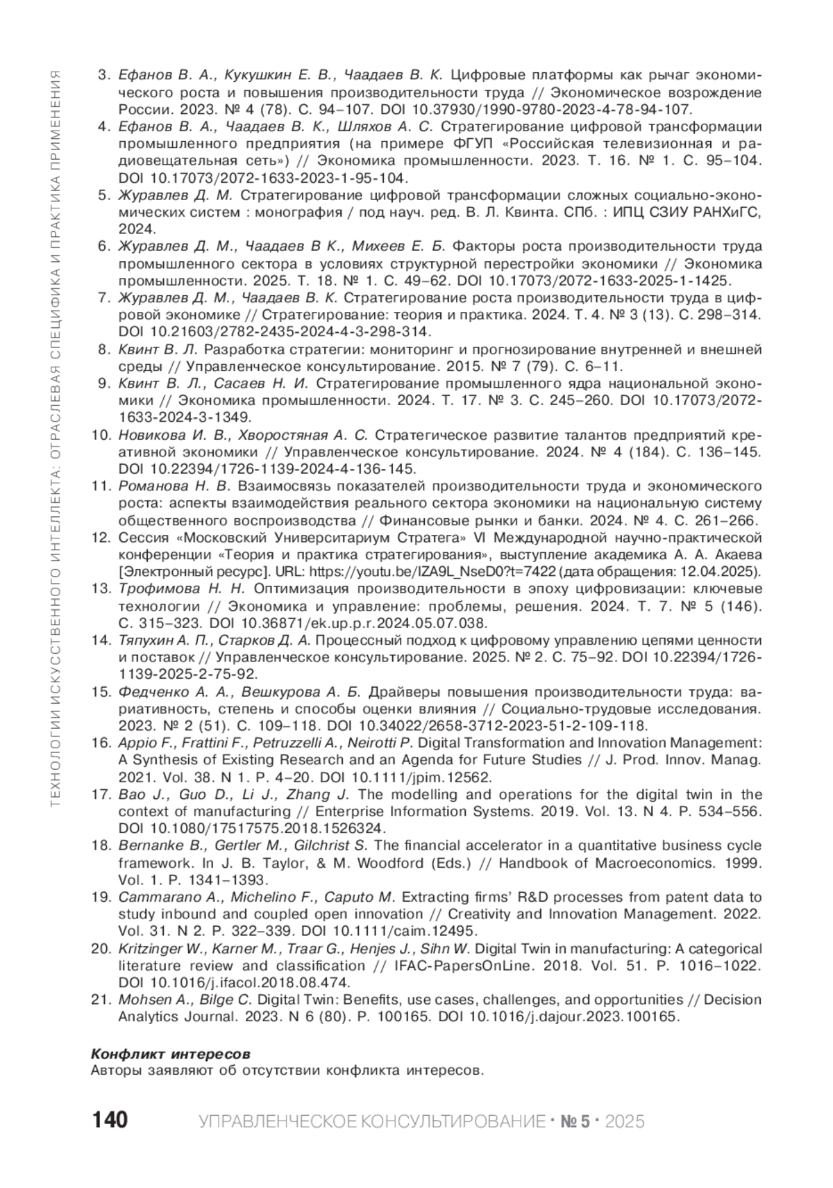 7. Журавлев Д. М., Чаадаев В. К. Стратегирование роста производительности труда в цифровой экономике // Стратегирование: теория и практика. 2024. Т. 4. № 3 (13). С. 298-314. https://doi.org/10.21603/2782-2435-2024-4-3-298-314.