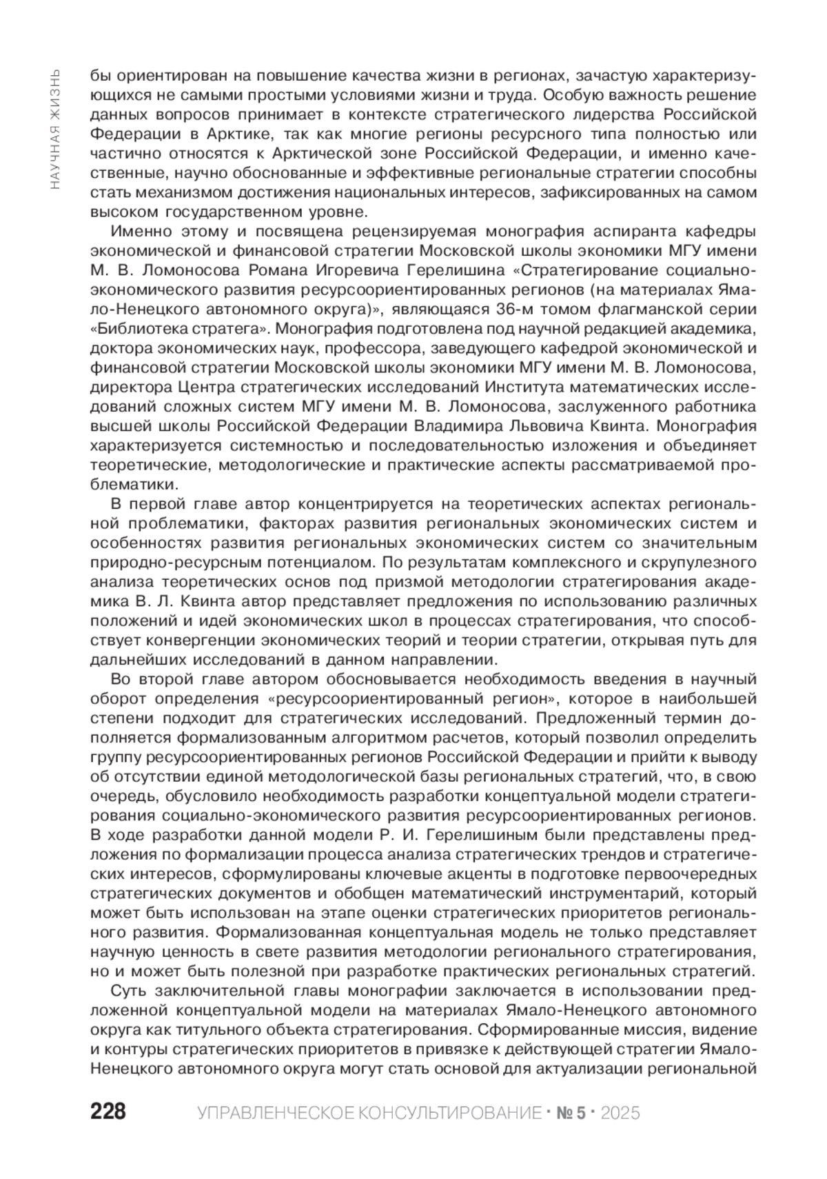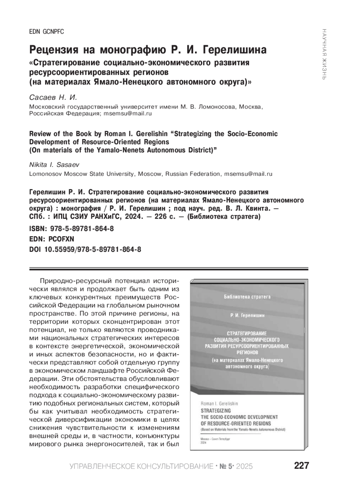 Герелишин Р. И. Стратегирование социально-экономического развития ресурсоориентированных регионов (на материалах Ямало-Ненецкого автономного округа): монография / Р. И. Герелишин; под науч. ред. В. Л. Квинта. — СПб.: ИПЦ СЗИУ РАНХиГС, 2024. — 226 с. — (Библиотека стратега) ISBN: 978-5-89781-864-8 EDN: PCOFXN DOI 10.55959/978-5-89781-864-8