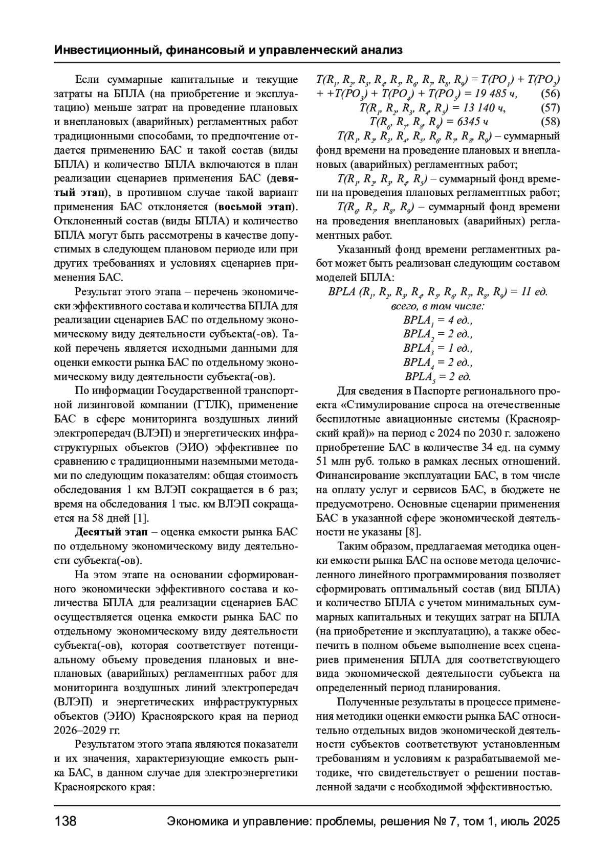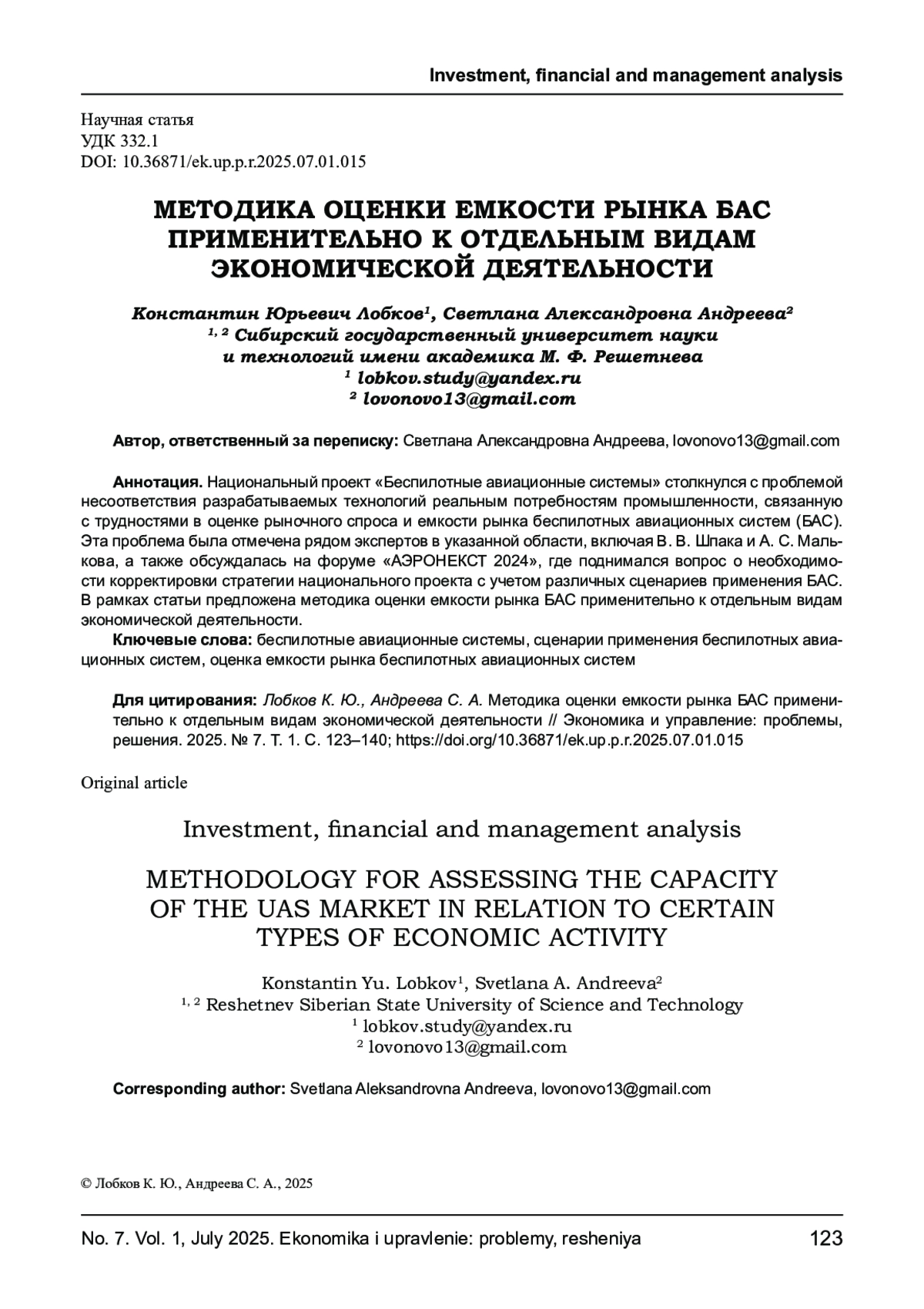 Национальный проект «Беспилотные авиационные системы» столкнулся с проблемой несоответствия разрабатываемых технологий реальным потребностям промышленности, связанную с трудностями в оценке рыночного спроса и емкости рынка беспилотных авиационных систем (БАС). Эта проблема была отмечена рядом экспертов в указанной области, включая В. В. Шпака и А. С. Малькова, а также обсуждалась на форуме «АЭРОНЕКСТ 2024», где поднимался вопрос о необходимости корректировки стратегии национального проекта с учетом различных сценариев применения БАС. В рамках статьи предложена методика оценки емкости рынка БАС применительно к отдельным видам экономической деятельности.