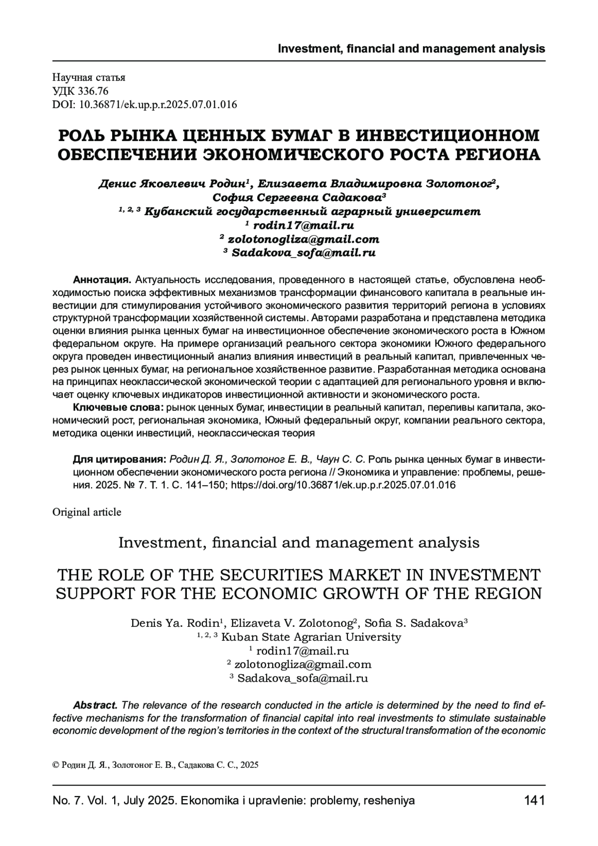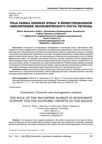 Актуальность исследования, проведенного в настоящей статье, обусловлена необходимостью поиска эффективных механизмов трансформации финансового капитала в реальные инвестиции для стимулирования устойчивого экономического развития территорий региона в условиях структурной трансформации хозяйственной системы. Авторами разработана и представлена методика оценки влияния рынка ценных бумаг на инвестиционное обеспечение экономического роста в Южном федеральном округе. На примере организаций реального сектора экономики Южного федерального округа проведен инвестиционный анализ влияния инвестиций в реальный капитал, привлеченных через рынок ценных бумаг, на региональное хозяйственное развитие. Разработанная методика основана на принципах неоклассической экономической теории с адаптацией для регионального уровня и включает оценку ключевых индикаторов инвестиционной активности и экономического роста.