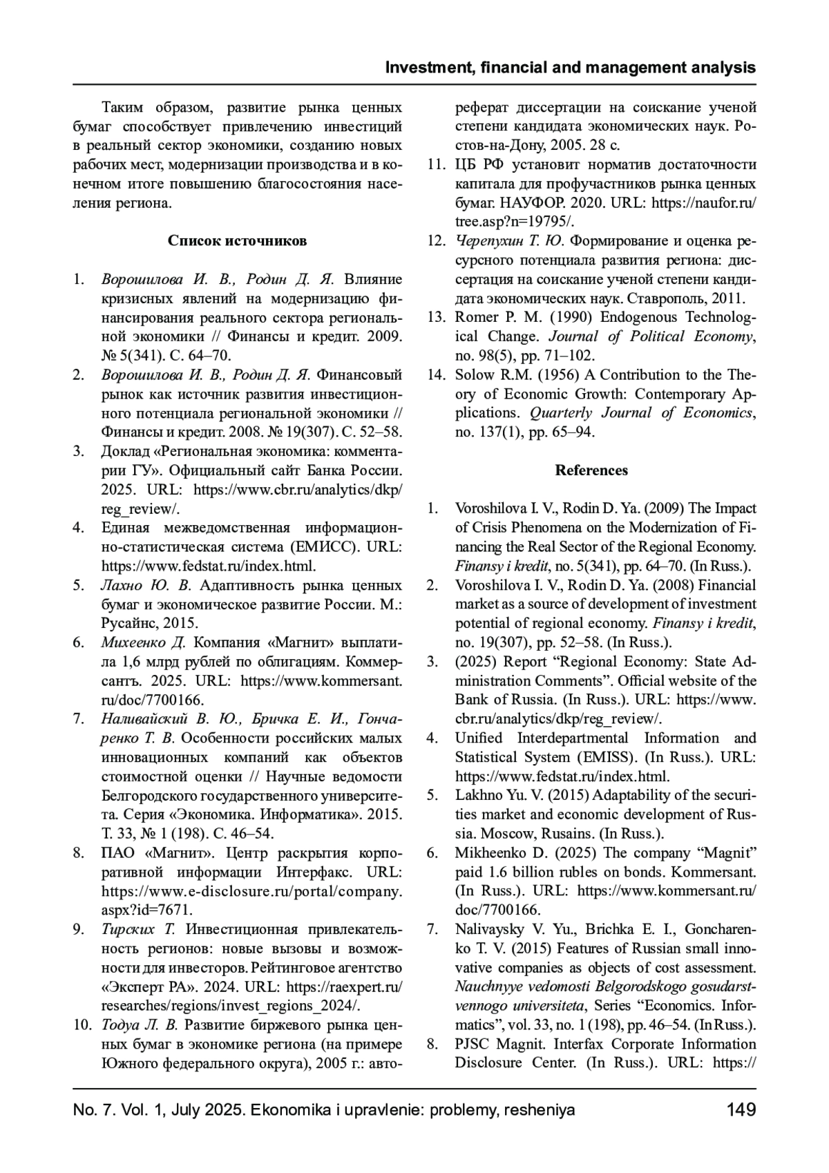 2. Ворошилова И. В., Родин Д. Я. Финансовый рынок как источник развития инвестиционного потенциала региональной экономики // Финансы и кредит. 2008. № 19(307). C. 52-58.