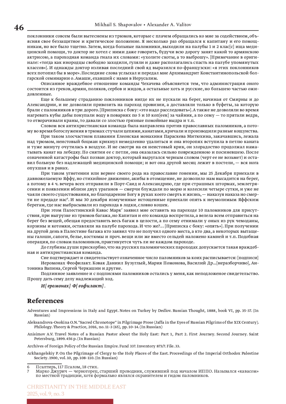 The aim of this study is to analyze the specific ways in which the voices of deck and hold passengers were represented in Russian pilgrimage literature at the turn of the 19th–20th centuries. Based on a systematic analysis of travel and pilgrimage accounts by G. Dyukov, A. Eliseev, A. Korovitsky, I. Bartsikhovsky, P. Bobrov, F. Grekov, and other authors, the article examines changes in the pilgrimage narrative and the mechanisms by which deck and hold passengers of the Russian Steamship and Trading Company (ROPiT) were able to express their views on the conditions of their journey to the Holy Land. Special attention is given to the analysis of the «voices from above», belonging to privileged first-class travelers, and the «voices from below», represented in texts primarily by provincial clergymen. The article also explores the activities of the Imperial Orthodox Palestine Society (IOPS), which systematically sought to improve the conditions of transportation for non-privileged passengers aboard ROPiT steamships. The response of the steamship company to public criticism of conditions on the maritime leg of the pilgrimage to Jerusalem is discussed, including conversations with ship crews and the publication of instructions and circulars on the organization of passenger transport on Russian steamships. In parallel, the printed polemics of V. Dedlov and A. Koptev are considered, reflecting an «upper-level» debate on the regulation of pilgrimage transportation. Particular attention is devoted to the evolution of the pilgrimage account as a genre. Within the framework of the article, for the first time, notes such as «On the Way to the Holy Land» by the St. Petersburg priest Ioann Labutin (1904) and «Travel Notes» by the hieromonk Theophilact of Pochaev Lavra (1914) are published. These texts combine pilgrimage narrative with observations of the everyday life of third-class passengers and serve as vivid evidence of the transformation of the «voice from below» in Russian pilgrimage literature at the turn of the 19th–20th centuries. The authors conclude that, although the «voice» of non-privileged pilgrims was most often expressed indirectly — through clergymen — it was precisely the latter who became an important channel for articulating social demands and a factor in the institutionalization of care for pilgrims. At the same time, the problems associated with the transportation of pilgrims to the Holy Land by ROPiT steamships were not only unresolved over more than half a century of the company’s activity, but also worsened due to the growing differentiation by 1914 between pilgrims, privileged passengers, and crew members. These difficulties shaped the distinctive social experience of ordinary Russian pilgrims.
