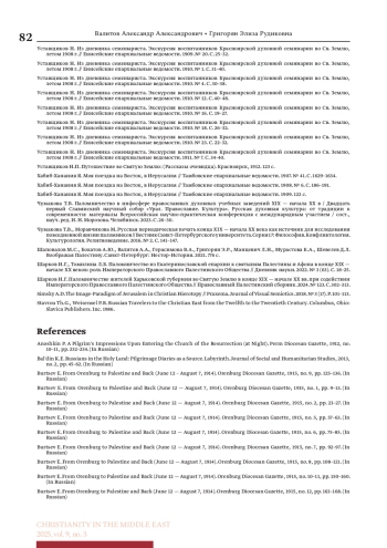 77. Шарков И.Г. Паломничество жителей Харьковской губернии во Святую Землю в конце XIX - начале XX вв. при содействии Императорского Православного Палестинского Общества // Православный Палестинский сборник. 2024. № 123. С. 302-313.