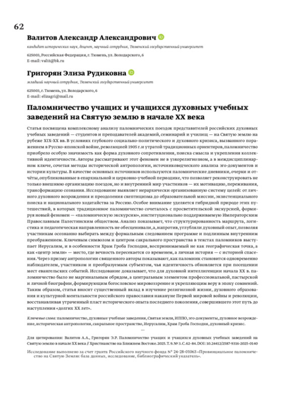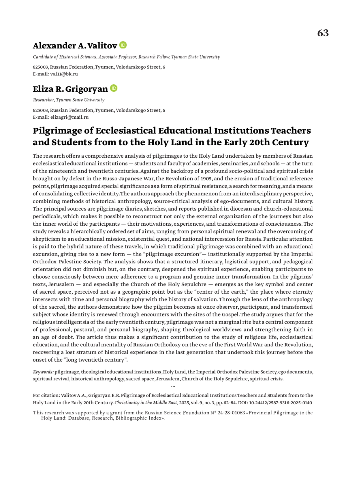 Статья посвящена комплексному анализу паломнических поездок представителей российских духовных учебных заведений — студентов и преподавателей академий, семинарий и училищ — на Святую землю на рубеже XIX–XX вв. В условиях глубокого социально-политического и духовного кризиса, вызванного поражением в Русско-японской войне, революцией 1905 г. и утратой традиционных ориентиров, паломничество приобрело особую значимость как форма духовного сопротивления, поиска смысла и укрепления коллективной идентичности. Авторы рассматривают этот феномен не в узкорелигиозном, а в междисциплинарном ключе, сочетая методы исторической антропологии, источниковедческого анализа эго-документов и истории культуры. В качестве основных источников используются паломнические дневники, очерки и отчёты, опубликованные в епархиальной и церковно-учебной периодике, что позволяет реконструировать не только внешнюю организацию поездок, но и внутренний мир участников — их мотивацию, переживания, трансформацию сознания. Исследование выявляет иерархически организованную систему целей: от личного духовного возрождения и преодоления скептицизма до образовательной миссии, экзистенциального поиска и национального ходатайства за Россию. Особое внимание уделяется гибридной природе этих путешествий, в которых традиционное паломничество сочеталось с просветительской экскурсией, формируя новый феномен — «паломническую экскурсию», институционально поддерживаемую Императорским Православным Палестинским обществом. Анализ показывает, что структурированность маршрута, логистика и педагогическая направленность не обесценивали, а, напротив, углубляли духовный опыт, позволяя участникам осознанно выбирать между формальным следованием программе и подлинным внутренним преображением. Ключевым символом и центром сакрального пространства в текстах паломников выступает Иерусалим, и в особенности Храм Гроба Господня, воспринимаемый не как географическая точка, а как «центр земли» — место, где вечность пересекается со временем, а личная история — с историей спасения. Через призму антропологии священного авторы показывают, как паломник становится одновременно наблюдателем, участником и преобразуемым субъектом, чья идентичность обновляется при посещении мест евангельских событий. Исследование доказывает, что для духовной интеллигенции начала XX в. паломничество было не маргинальным обрядом, а центральным элементом профессиональной, пастырской и личной биографии, формирующим богословское мировоззрение и укрепляющим веру в эпоху сомнений. Таким образом, статья вносит существенный вклад в изучение религиозной жизни, духовного образования и культурной ментальности российского православия накануне Первой мировой войны и революции, восстанавливая утраченный пласт исторического опыта последнего поколения, совершившего этот путь до наступления «долгих XX лет».