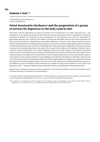 13. Каиль М.В. Церковная дипломатия в СССР 1960-х гг. в частном рапорте епископа Питирима (Нечаева) митрополиту Никодиму (Ротову) о паломничестве в Святую Землю // Вестник архивиста. 2023. № 2. С. 474-490.