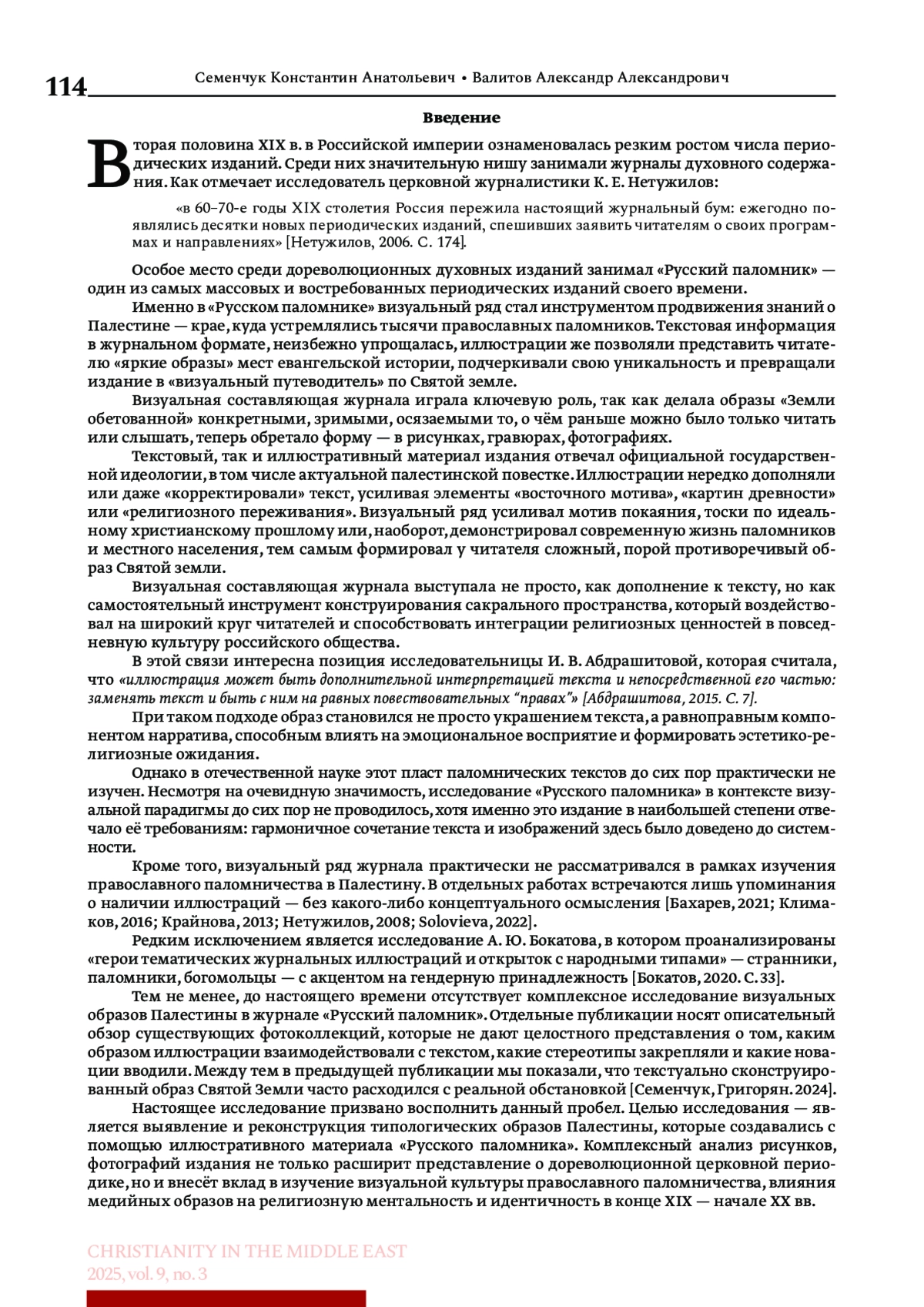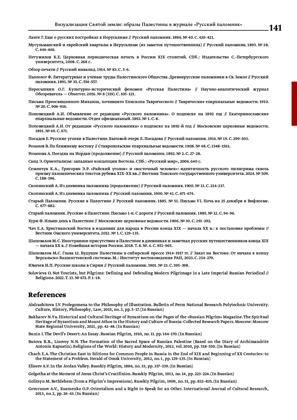 31. Семенчук К.А., Григорян Э.Р. “Райский уголок” и “восточный человек”: идентичность русского пилигрима сквозь призму паломнических текстов рубежа XIX-XX вв. // Вестник Томского государственного университета. 2024. № 509. С. 188-196.