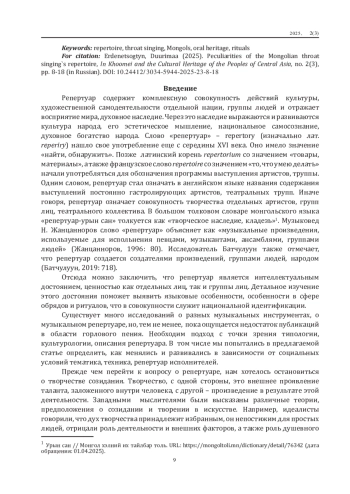 Репертуар содержит комплексную совокупность действий культуры, художественной самодеятельности отдельной нации, группы людей и отражаетвосприятие мира, духовное наследие. Через это наследие выражаются и развиваютсякультура народа, его эстетическое мышление, национальное самосознание, духовное богатство народа. Слово «репертуар» – repertory (изначально лат. reperiry) нашло свое употребление еще с середины XVI века. Оно имело значение«найти, обнаружить». Позже латинский корень repertorium со значением «товары, материалы», а также французское слово repertoire со значением «то, что умею делать»начали употребляться для обозначения программы выступления артистов, труппы. Одним словом, репертуар стал означать в английском языке названия содержаниявыступлений постоянно гастролирующих артистов, театральных трупп. Иначеговоря, репертуар означает совокупность творчества отдельных артистов, групплиц, театрального коллектива. В большом толковом словаре монгольского языка«репертуар-урын сан» толкуется как «творческое наследие, кладезь»1. МузыковедН. Жанцанноров слово «репертуар» объясняет как «музыкальные произведения, используемые для испольнения певцами, музыкантами, ансамблями, группамилюдей» (Жанцанноров, 1996: 80). Исследователь Батчулуун также отмечает, что репертуар создается создателями произведений, группами людей, народом(Батчулуун, 2019: 718).