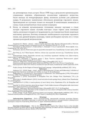 В эпоху, когда сохранение внутренних качеств этнического искусства и культуры, а также акцентирование на них стало критически важным, трансграничное распространение искусства хоомия посредством краткосрочных программ обучения и наставничества выявляет заметные тенденции. К ним относятся процессы ассимиляции, дифференциации и конвергенции практик, где одна форма влияет на другую, или же перенимает элементы другой. Данное исследование фокусировано на мобильных краткосрочных программах обучения хоомия, организованных Баатарыном Одсурэном – известным педагогом и основателем формального обучения монгольскому искусству хоомия в классах в соседних регионах и странах Евразии. Основная цель статьи состоит в исследовании вклада Б. Одсурэна в глобальное развитие обучения искусству хоомия в классах. К методологии исследования относятся такие этнографические инструменты, как интервью и устный рассказ, подкрепленный анализом сопутствующих работ, включая диссертации бакалавров, магистров и докторов наук, научные статьи, презентации, книги, руководства и интервью как из цифровых, так и из печатных СМИ. Собранные данные были проанализированы и синтезированы для проведения всестороннего анализа.
