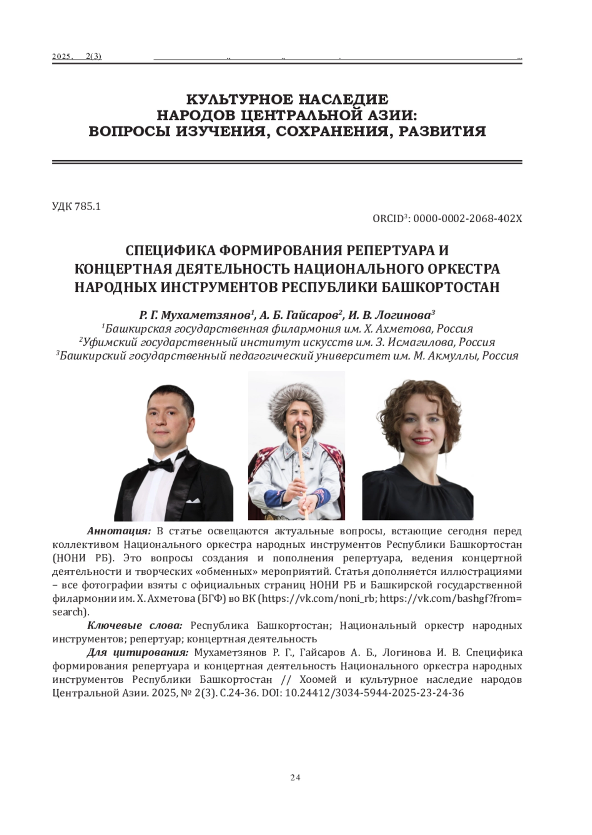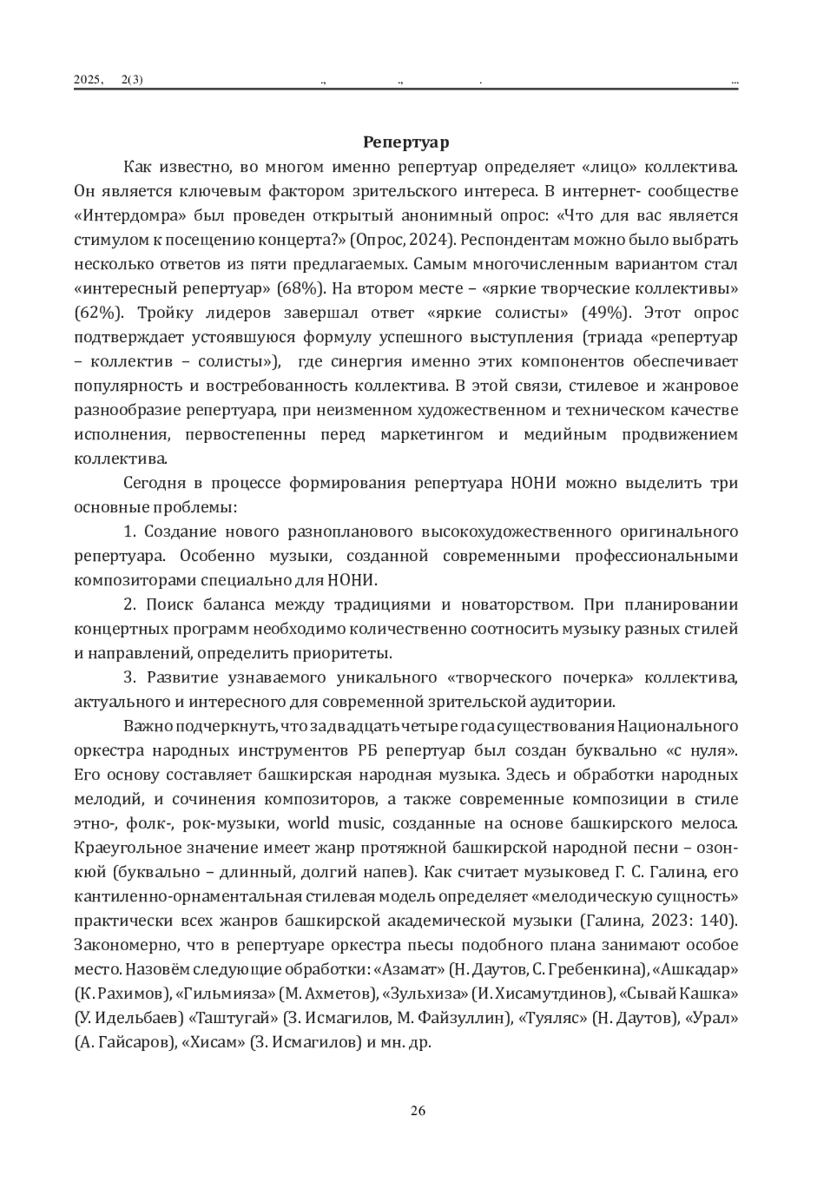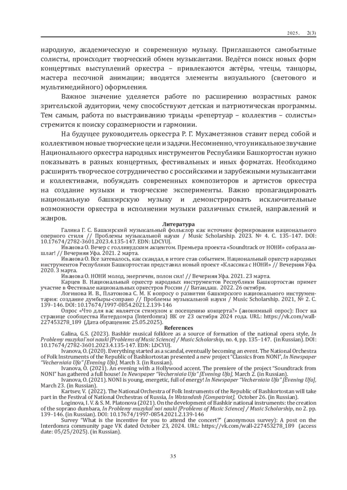 1. Галина Г. С. Башкирский музыкальный фольклор как источник формирования национального оперного стиля // Проблемы музыкальной науки / Music Scholarship. 2023. № 4. С. 135-147. DOI: 10.17674/2782-3601.2023.4.135-147