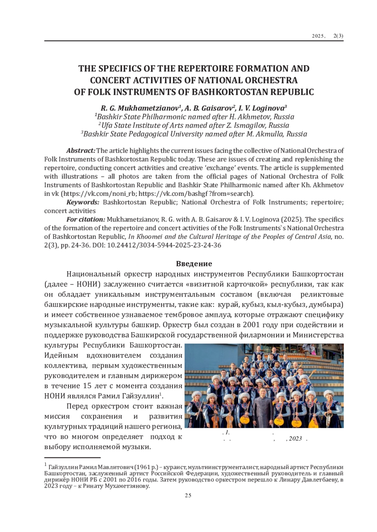 Национальный оркестр народных инструментов Республики Башкортостан(далее – НОНИ) заслуженно считается «визитной карточкой» республики, так какон обладает уникальным инструментальным составом (включая реликтовыебашкирские народные инструменты, такие как: курай, кубыз, кыл-кубыз, думбыра)и имеет собственное узнаваемое тембровое амплуа, которые отражают спецификумузыкальной культуры башкир. Оркестр был создан в 2001 году при содействии иподдержке руководства Башкирской государственной филармонии и Министерствакультуры Республики Башкортостан. Идейным вдохновителем созданияколлектива, первым художественнымруководителем и главным дирижеромв течение 15 лет с момента созданияНОНИ являлся Рамил Гайзуллин1.