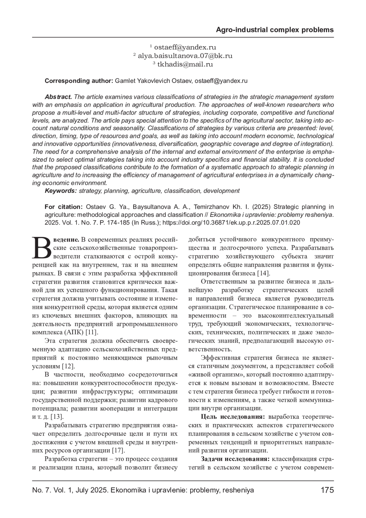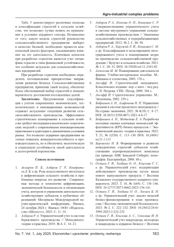 В статье рассматриваются различные классификации стратегий в системе стратегического управления с акцентом на применение в сельскохозяйственном производстве. Анализируются подходы известных исследователей, которые предлагают многоуровневую и многофакторную структуру стратегий, включающую корпоративные, конкурентные и функциональные уровни. В статье особое внимание уделяется специфике аграрного сектора, учитывающей природные условия и сезонность. Представлены классификации стратегий по различным признакам: уровню, направлению, срокам, типу ресурсов и целям, а также с учетом современных экономических, технологических и инновационных возможностей (инновационность, диверсификация, географический охват и степень интеграции). Подчеркивается необходимость комплексного анализа внутренней и внешней среды предприятия для выбора оптимальных стратегий с учетом отраслевой специфики и финансовой устойчивости. Сделан вывод, что предложенные классификации способствуют формированию системного подхода к стратегическому планированию в сельском хозяйстве и повышению эффективности управления аграрными предприятиями в условиях динамично меняющейся экономической среды.