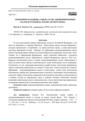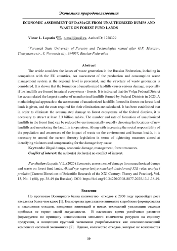 В статье рассмотрены вопросы образования отходов в Российской Федерации, в том числе по сравнению со странами Евросоюза. Представлена оценка системы обращения с отходами производства и потребления на уровне регионов страны, а также рассмотрена структура образования отходов. Показано, что образование несанкционированных свалок наносит серьезный ущерб, особенно если свалки образуются в природных экосистемах- лесах. Указано, что в Приволжский федеральном округе накоплено наибольшее количество несанкционированных свалок, образованных в разрезе Федеральных округов в 2023 году. Приведен методический подход к оценке несанкционированных свалок, образующихся в лесах на землях лесного фонда, и выполнен расчет затрат необходимых для их ликвидации. Установлено, что для ликвидации накопленного ущерба лесным экосистемам федеральных округов необходимо привлечение до не менее 3,3 млрд. руб. Снизить количество и скорость образования несанкционированных свалок в лесном фонде можно путем экологически обоснованного выбора мест размещения новых полигонов и мониторинга эксплуатируемых полигонов. Наряду повышением социальной ответственности населения и осведомленности о влиянии отходов на окружающую среду и здоровье человека, необходимо внесение изменений в действующее лесное законодательство, в части ужесточения мер направленных на выявление нарушителей и компенсации наносимого ими ущерба.
