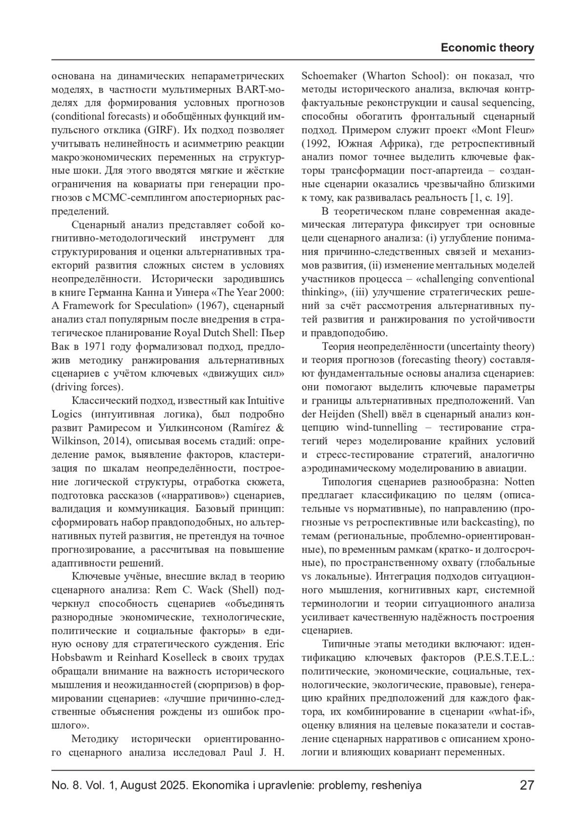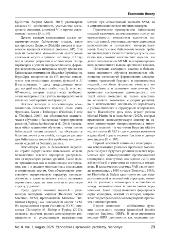 В статье рассматриваются теоретико-методологические основы интеграции сценарного анализа и многомерных байесовских моделей машинного обучения. Сценарный анализ представлен как инструмент стратегического планирования в условиях радикальной неопределённости, позволяющий формировать альтернативные траектории развития сложных систем. В свою очередь, байесовские модели в машинном обучении - в том числе Bayesian additive regression trees (BART), байесовские нейронные сети (BNN) и вариационные байесовские методы - обеспечивают формальное представление априорной неопределённости и латентной структуры данных. Особое внимание уделено методам построения условных прогнозов и обобщённых функций импульсного отклика (GIRF), адаптированным для нелинейных и непараметрических моделей. Обоснована практическая значимость данного подхода в макроэкономическом моделировании, энергетическом планировании и оценке инвестиционных рисков.