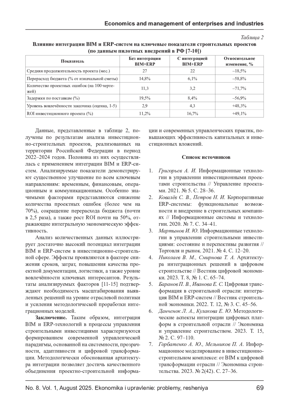 5. Баранов П. В., Иванова Е. С. Цифровая трансформация в строительной отрасли: интеграция BIM и ERP-систем // Вестник строительной экономики. 2022. Т. 12, № 3. С. 45-56.
