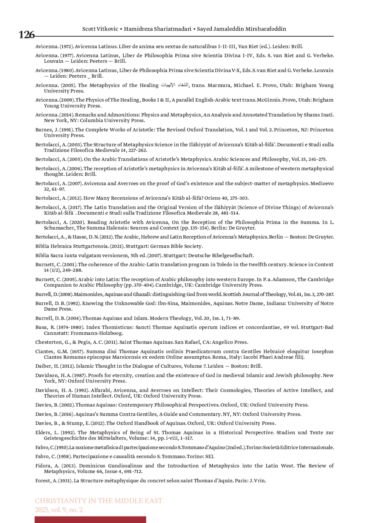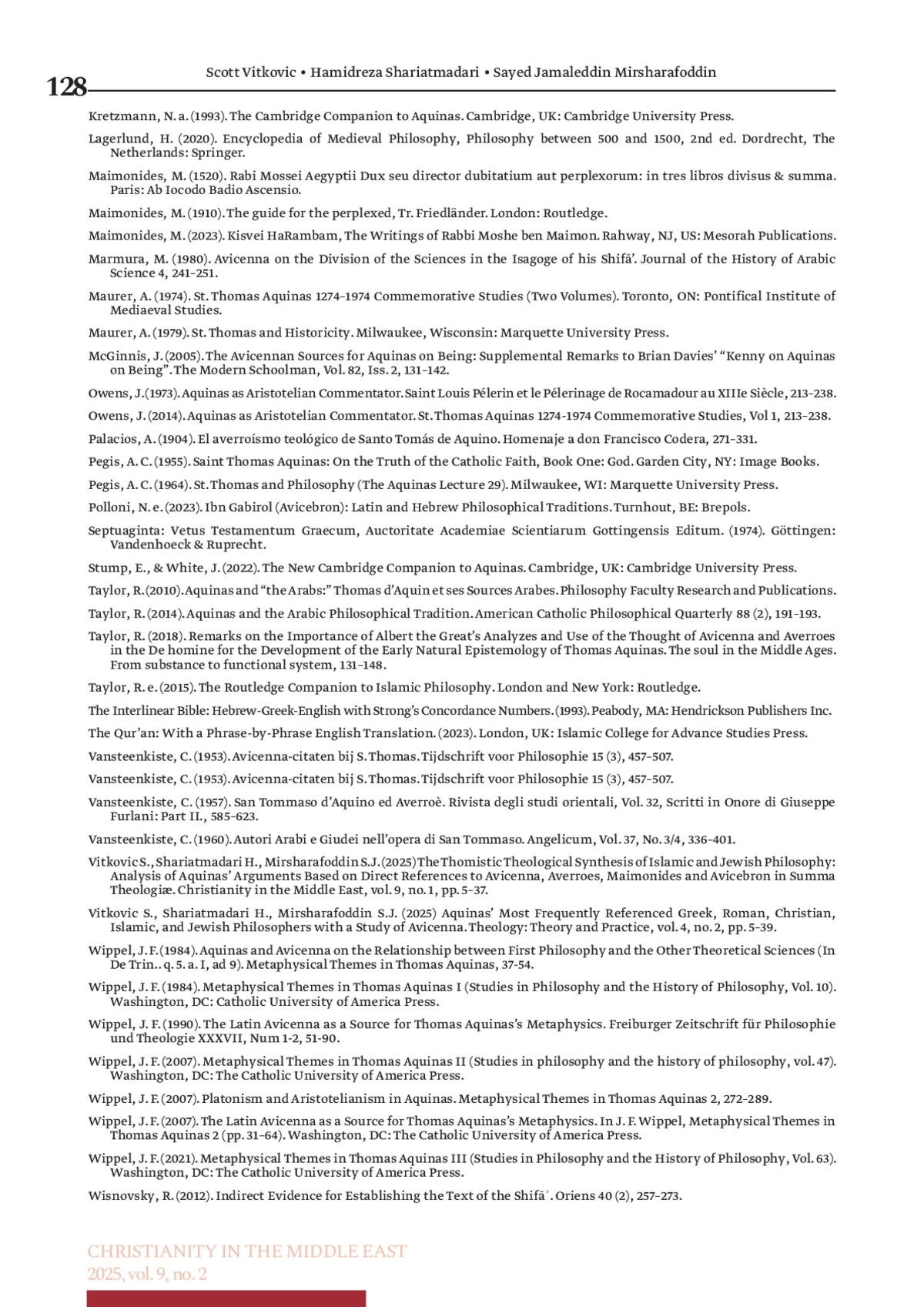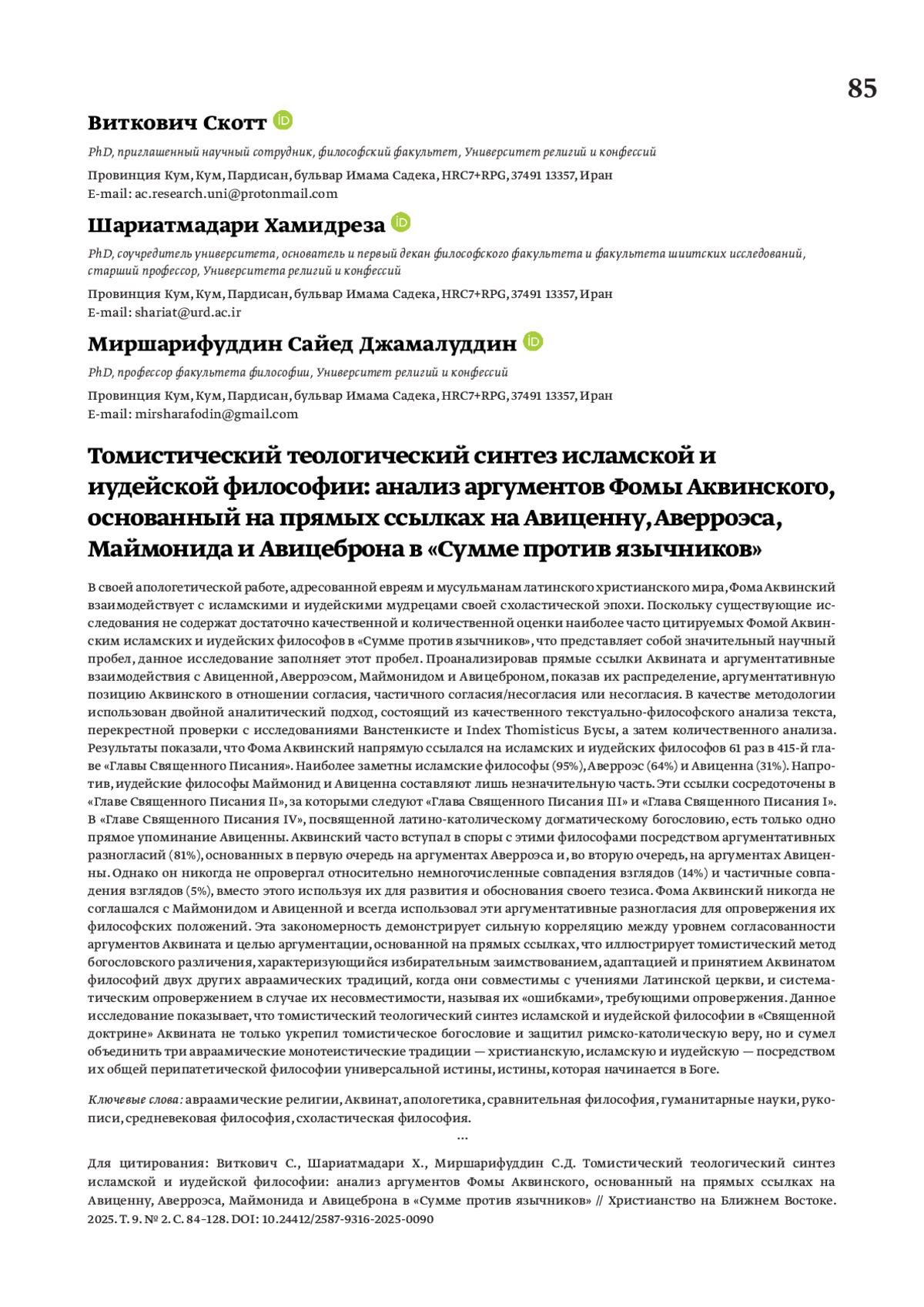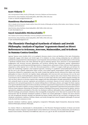 ВИТКОВИЧ С., ШАРИАТМАДАРИ Х., МИРШАРИФУДДИН С. Д. ТОМИСТИЧЕСКИЙ ТЕОЛОГИЧЕСКИЙ СИНТЕЗ ИСЛАМСКОЙ И ИУДЕЙСКОЙ ФИЛОСОФИИ: АНАЛИЗ АРГУМЕНТОВ ФОМЫ АКВИНСКОГО, ОСНОВАННЫЙ НА ПРЯМЫХ ССЫЛКАХ НА АВИЦЕННУ, АВЕРРОЭСА, МАЙМОНИДА И АВИЦЕБРОНА В «СУММЕ ПРОТИВ ЯЗЫЧНИКОВ» // ХРИСТИАНСТВО НА БЛИЖНЕМ ВОСТОКЕ. 2025. № 2, ТОМ 9