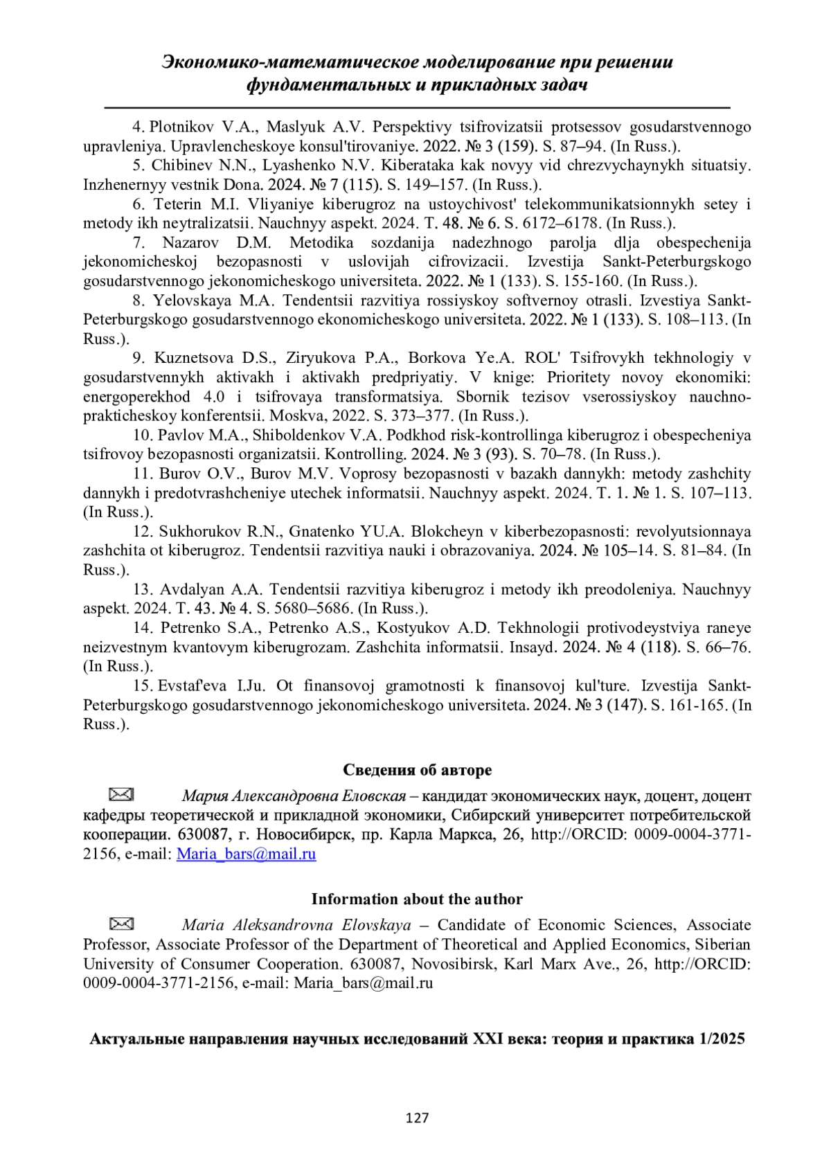 7. Назаров Д.М. Методика создания надежного пароля для обеспечения экономической безопасности в условиях цифровизации. Известия Санкт-Петербургского государственного экономического университета. 2022. № 1 (133). С. 155-160. EDN: JNFFUE