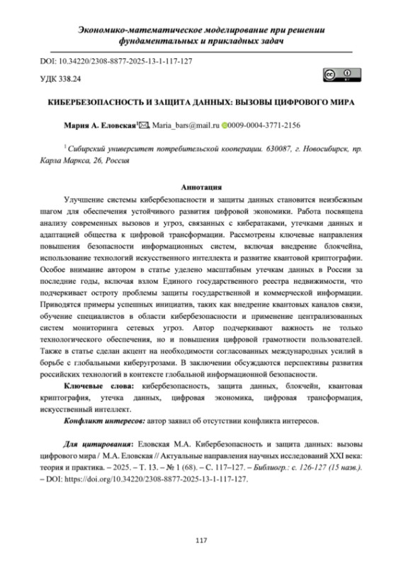Улучшение системы кибербезопасности и защиты данных становится неизбежным шагом для обеспечения устойчивого развития цифровой экономики. Работа посвящена анализу современных вызовов и угроз, связанных с кибератаками, утечками данных и адаптацией общества к цифровой трансформации. Рассмотрены ключевые направления повышения безопасности информационных систем, включая внедрение блокчейна, использование технологий искусственного интеллекта и развитие квантовой криптографии. Особое внимание автором в статье уделено масштабным утечкам данных в России за последние годы, включая взлом Единого государственного реестра недвижимости, что подчеркивает остроту проблемы защиты государственной и коммерческой информации. Приводятся примеры успешных инициатив, таких как внедрение квантовых каналов связи, обучение специалистов в области кибербезопасности и применение централизованных систем мониторинга сетевых угроз. Автор подчеркивают важность не только технологического обеспечения, но и повышения цифровой грамотности пользователей. Также в статье сделан акцент на необходимости согласованных международных усилий в борьбе с глобальными киберугрозами. В заключении обсуждаются перспективы развития российских технологий в контексте глобальной информационной безопасности.