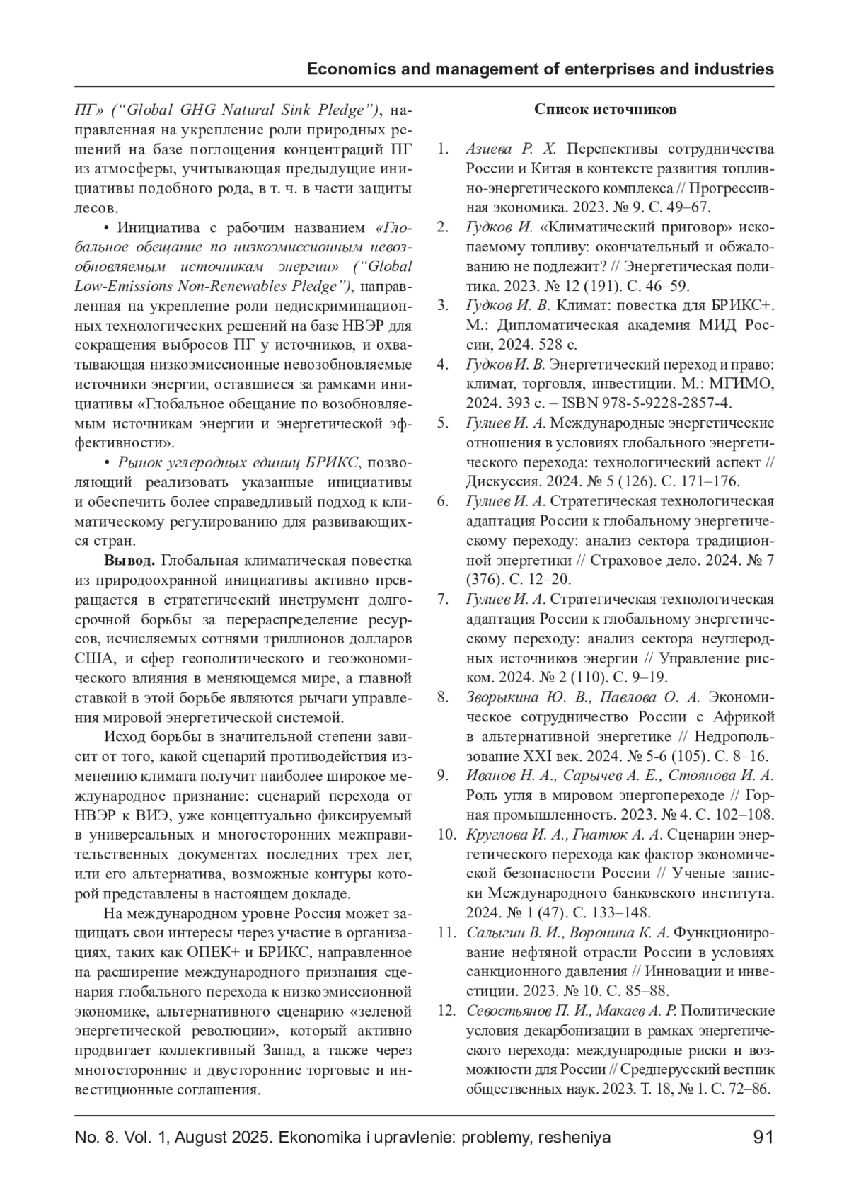 6. Гулиев И. А. Стратегическая технологическая адаптация России к глобальному энергетическому переходу: анализ сектора традиционной энергетики // Страховое дело. 2024. № 7 (376). С. 12-20. EDN: QSKTAM