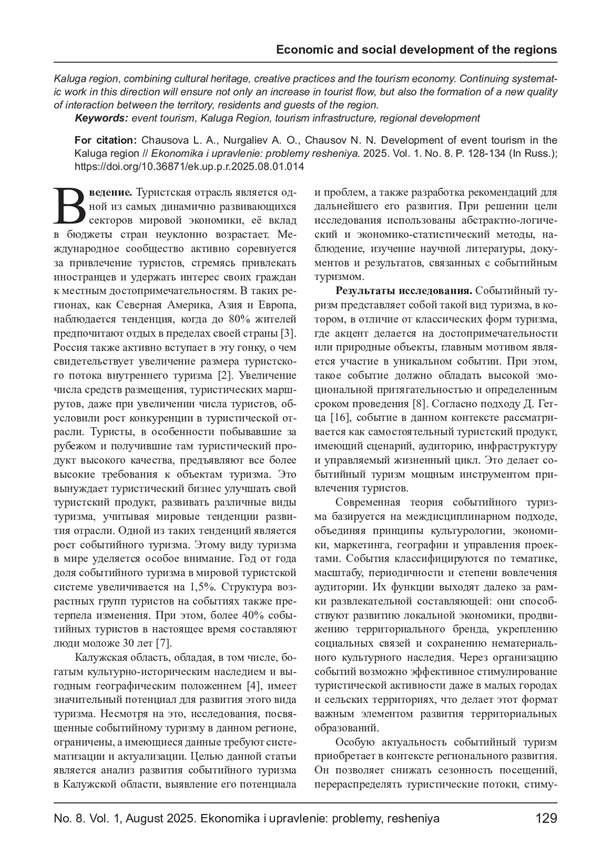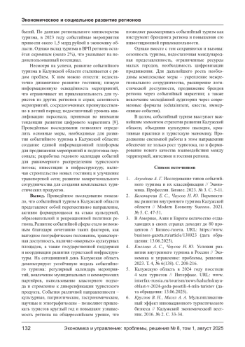 ЧАУСОВА Л. А., НУРГАЛИЕВ А. О., ЧАУСОВ Н. Н. РАЗВИТИЕ СОБЫТИЙНОГО ТУРИЗМА В КАЛУЖСКОЙ ОБЛАСТИ // ЭКОНОМИКА И УПРАВЛЕНИЕ: ПРОБЛЕМЫ, РЕШЕНИЯ. 2025. ТОМ 1 № 8