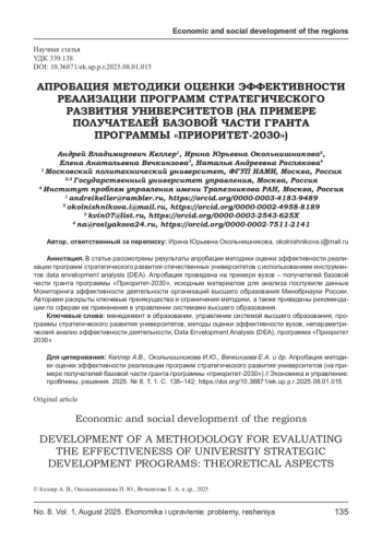 КЕЛЛЕР А. В., ОКОЛЬНИШНИКОВА И. Ю., ВЕЧКИНЗОВА Е. А., РОСЛЯКОВА Н. А. АПРОБАЦИЯ МЕТОДИКИ ОЦЕНКИ ЭФФЕКТИВНОСТИ РЕАЛИЗАЦИИ ПРОГРАММ СТРАТЕГИЧЕСКОГО РАЗВИТИЯ УНИВЕРСИТЕТОВ (НА ПРИМЕРЕ ПОЛУЧАТЕЛЕЙ БАЗОВОЙ ЧАСТИ ГРАНТА ПРОГРАММЫ «ПРИОРИТЕТ-2030») // ЭКОНОМИКА И УПРАВЛЕНИЕ: ПРОБЛЕМЫ, РЕШЕНИЯ. 2025. ТОМ 1 № 8