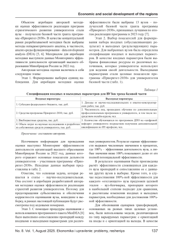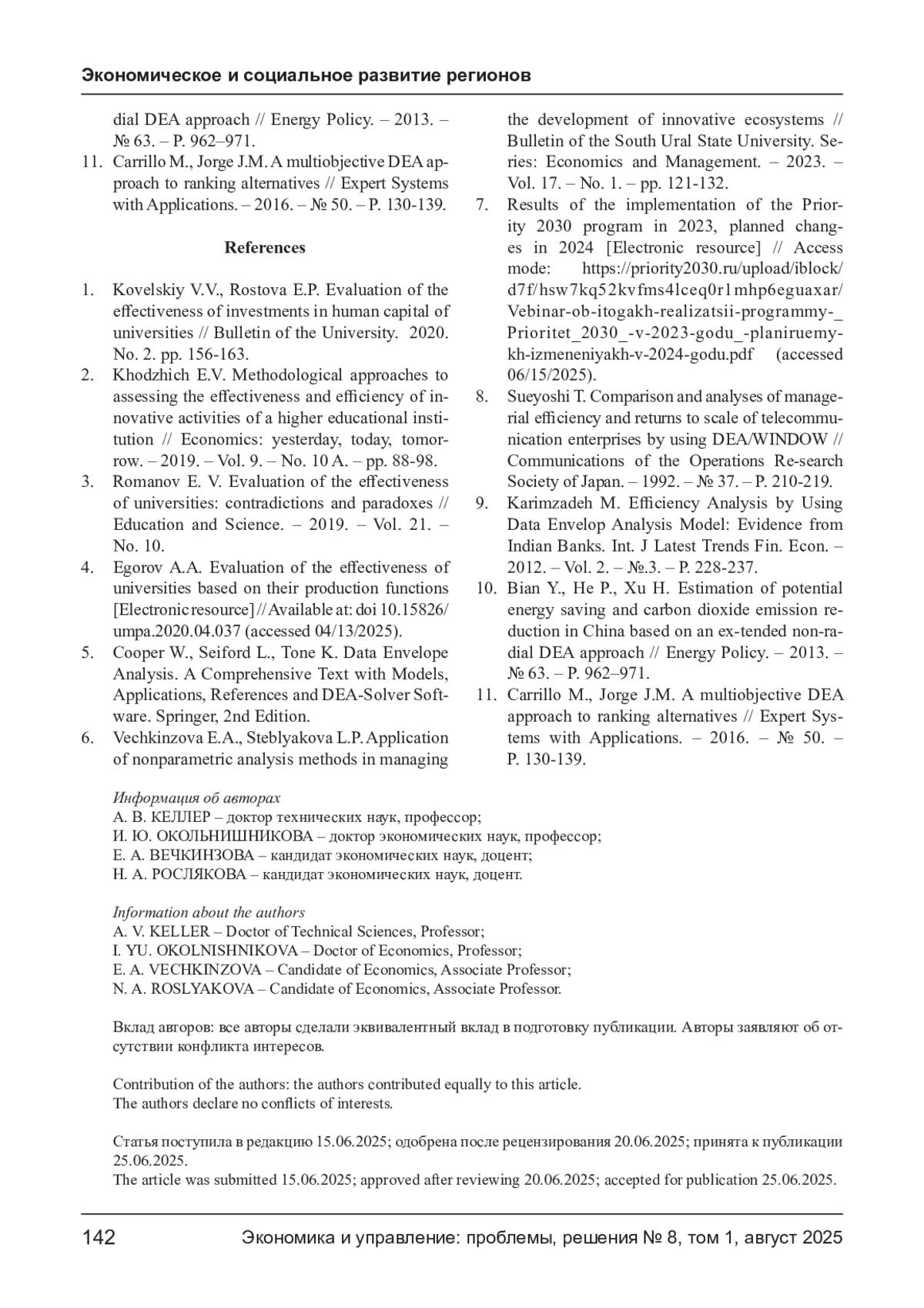 Ключевые фразы: менеджмент в образовании, управление системой высшего образования, программы стратегического развития университетов, методы оценки эффективности вузов, непараметрический анализ эффективности деятельности, data envelopment analysis (dea), программа «приоритет 2030»